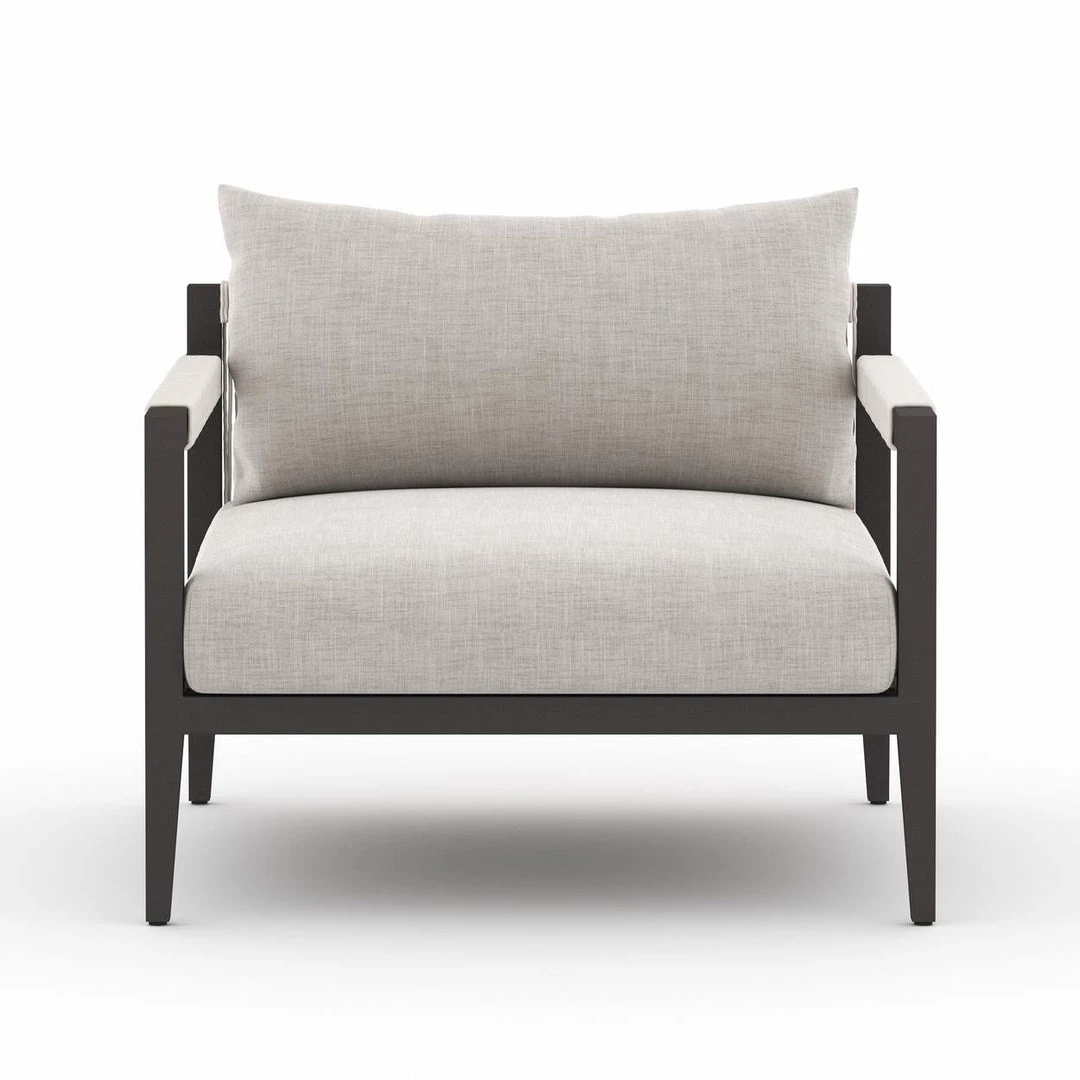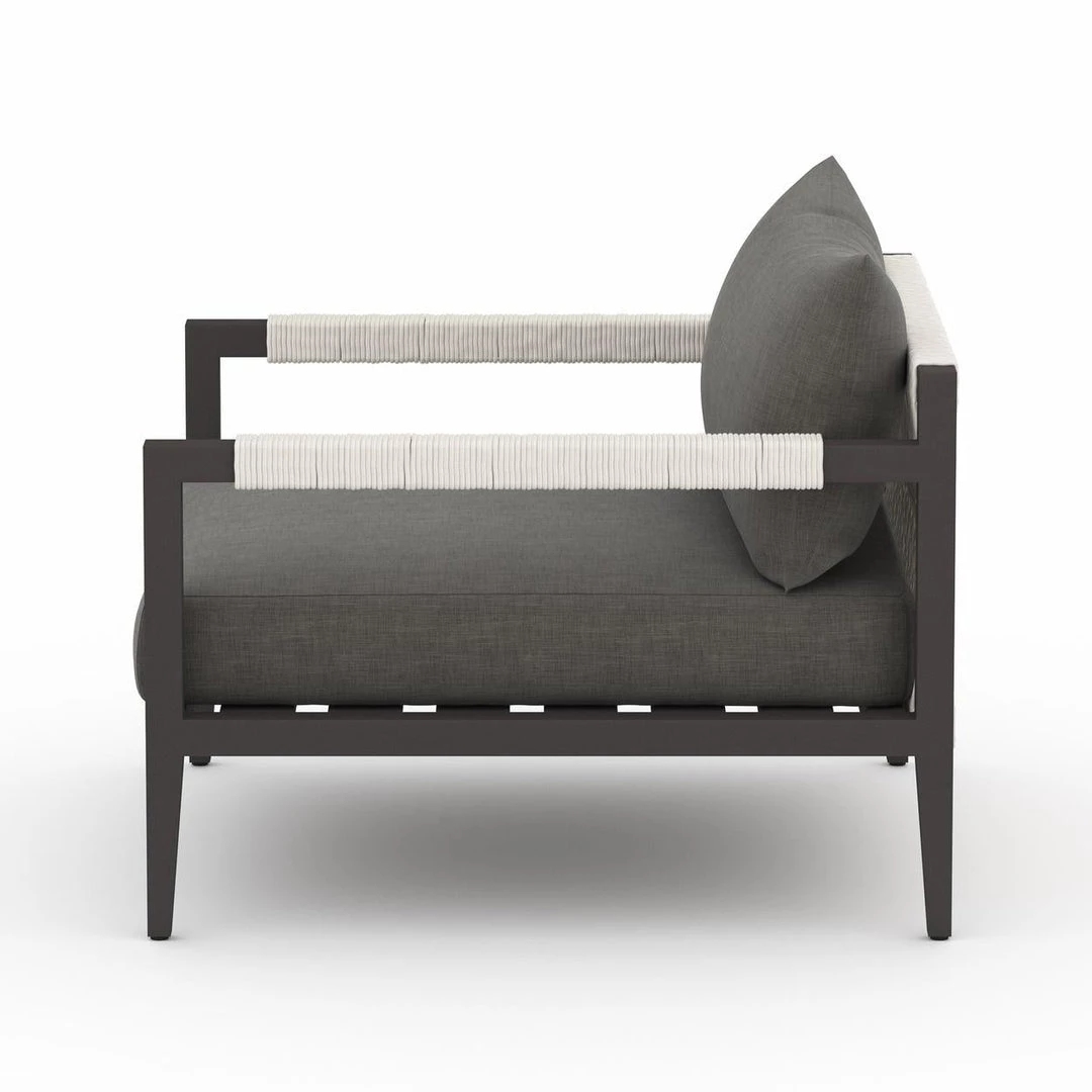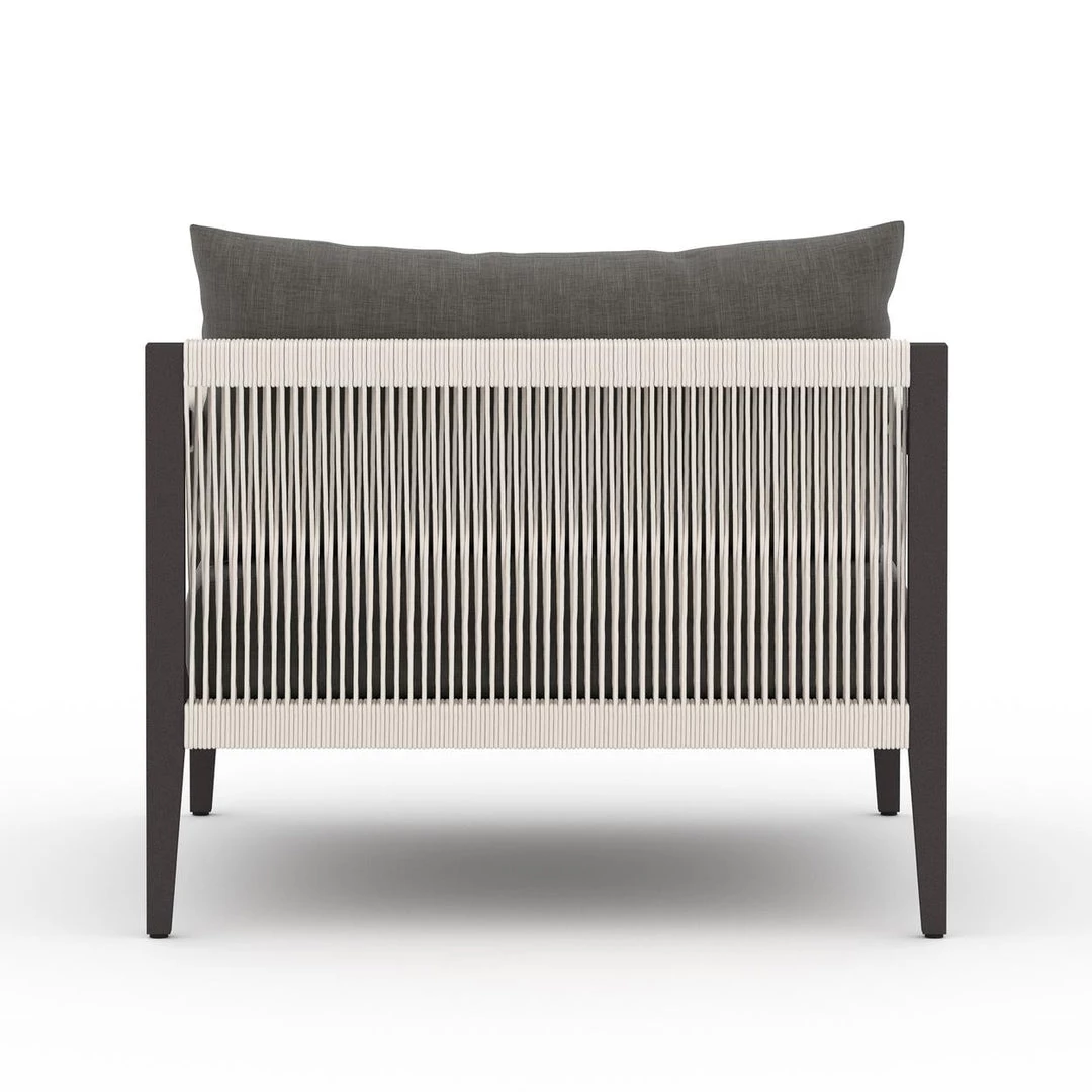 Modern materials ready a stylish silhouette for the outdoors. Sturdy aluminum forms a clean frame for UV-resistant, water-repellent Sunproof fabric on this outdoor chair. Rope-wrapped armrests and rear cotton weaving add a textured finishing touch. Cover or store indoors during inclement weather.