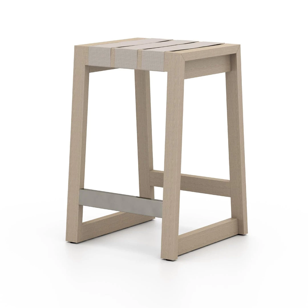 Pull up a stool and stay a while. FSC-certified teak forms an airy, angular frame, with kick plates for comfort plus strap seat detailing for textural intrigue. Cover or store indoors during inclement weather and when not in use.