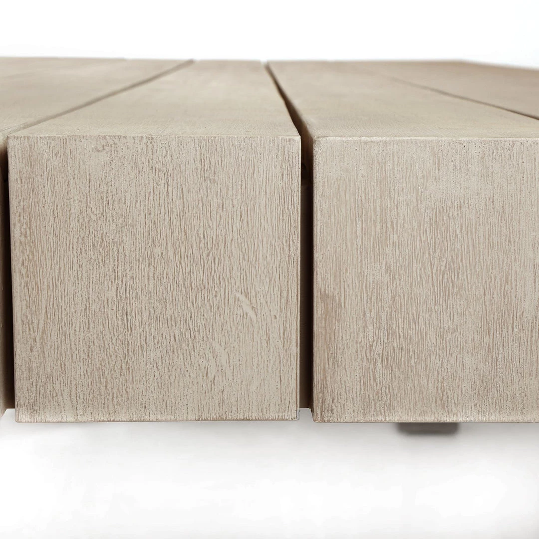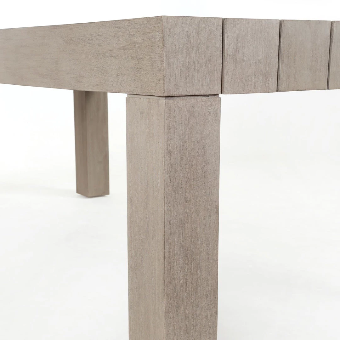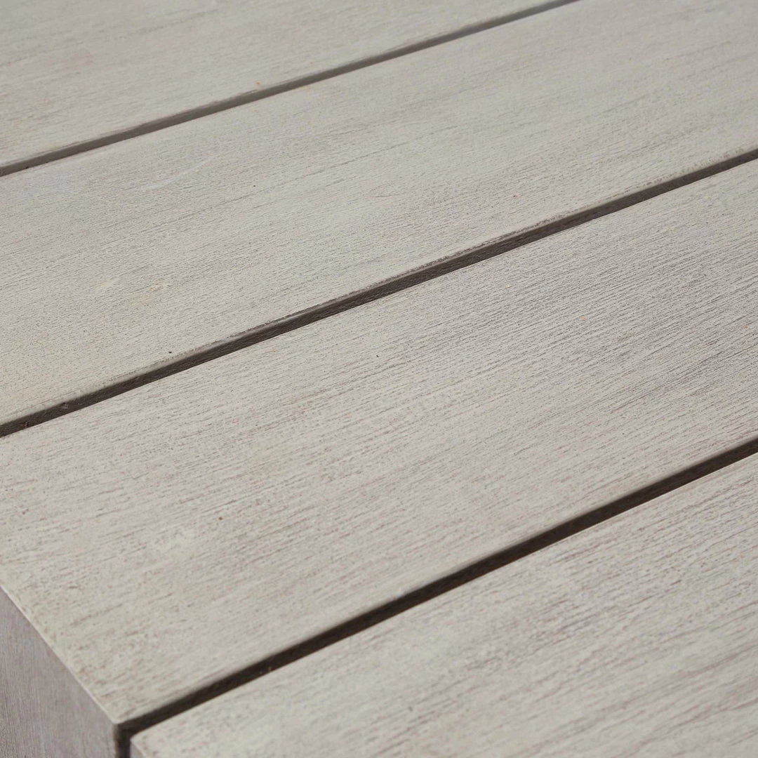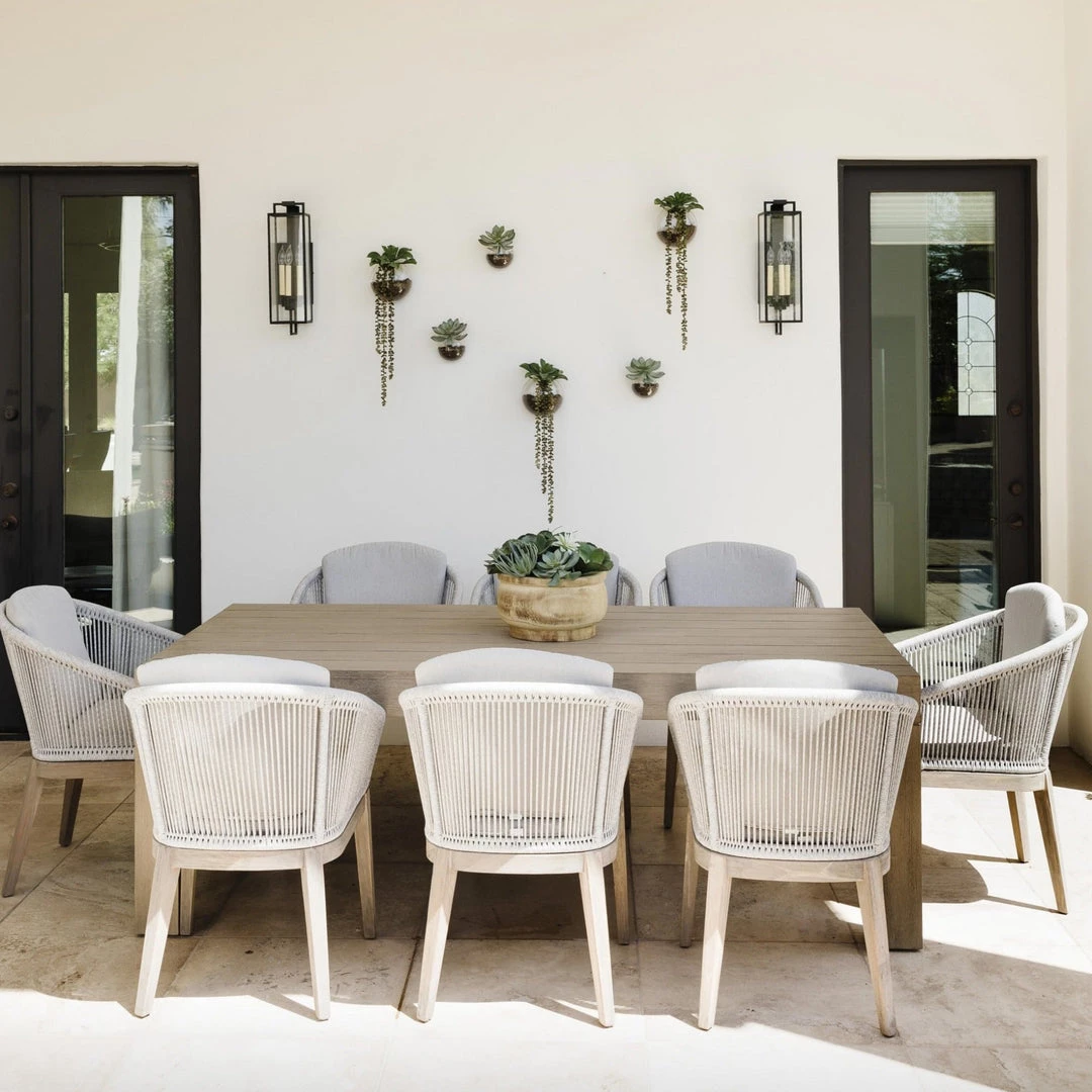 Organic elements, indoors or out. Teak wood is fashioned into a clean-lined dining table and weathered to a natural grey. Safe for outdoor use — cover or store indoors during inclement weather and when not in use.