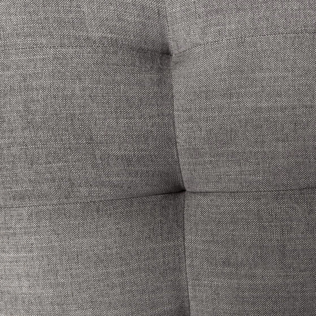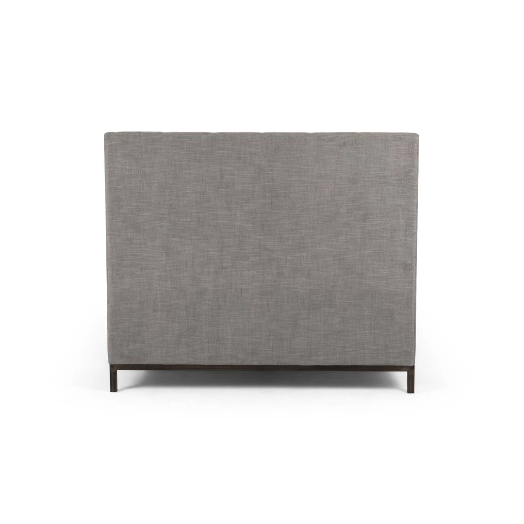 Subtle, modern elegance. A low, tufted headboard in a textural grey pairs with a simple gunmetal iron base.