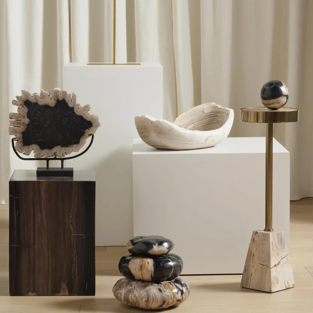 A decorative bowl made from light-finished petrified woods serves as a stylish, nature-driven catchall atop an entryway piece, console or coffee table.