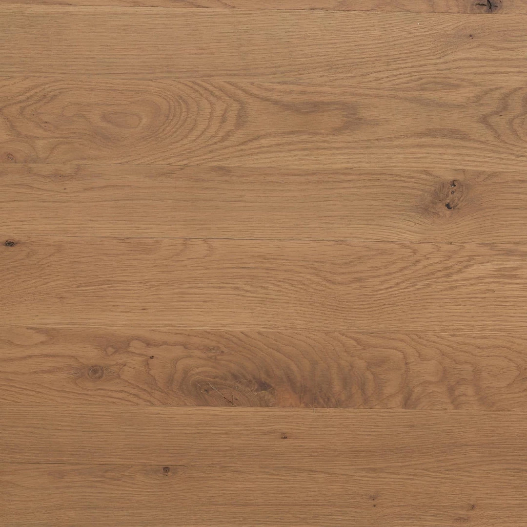 A shape-driven desk made from thick-cut oak veneer features overscale proportions in a warm grey-brown finish and spacious side cabinetry with a cutout for cord management.