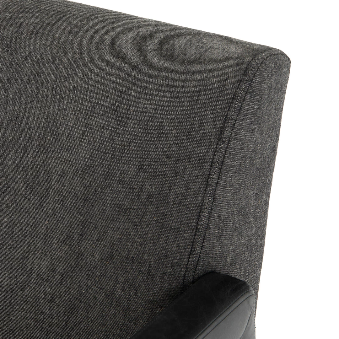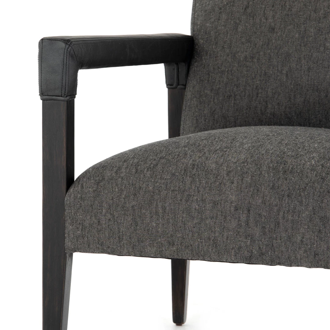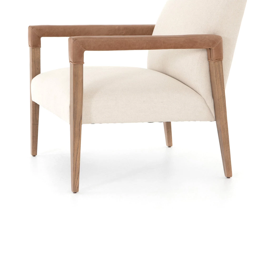Elegance is no exaggeration. Slim, tapered nettlewood with arms wrapped in vintage leather frames a floating seat covered in a natural cotton and linen blend.