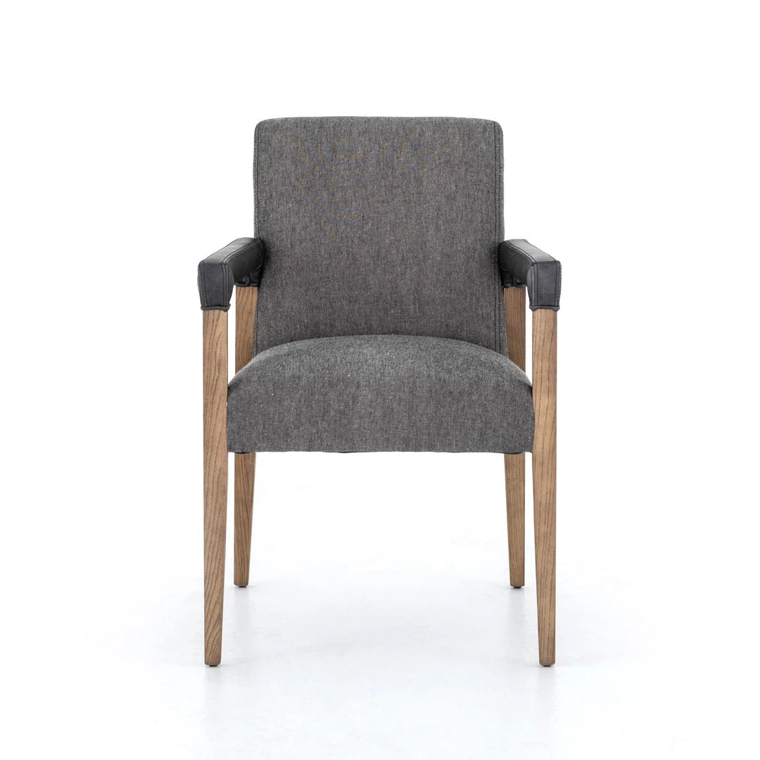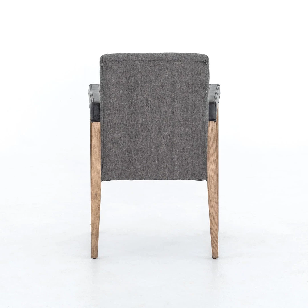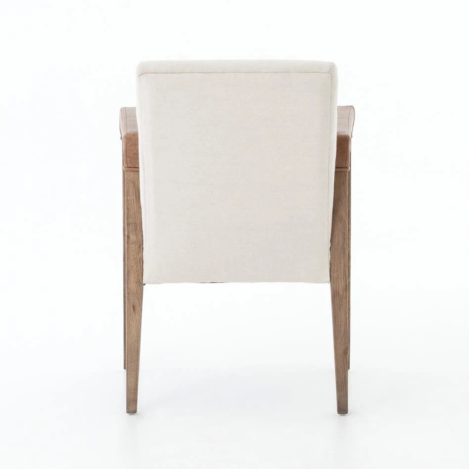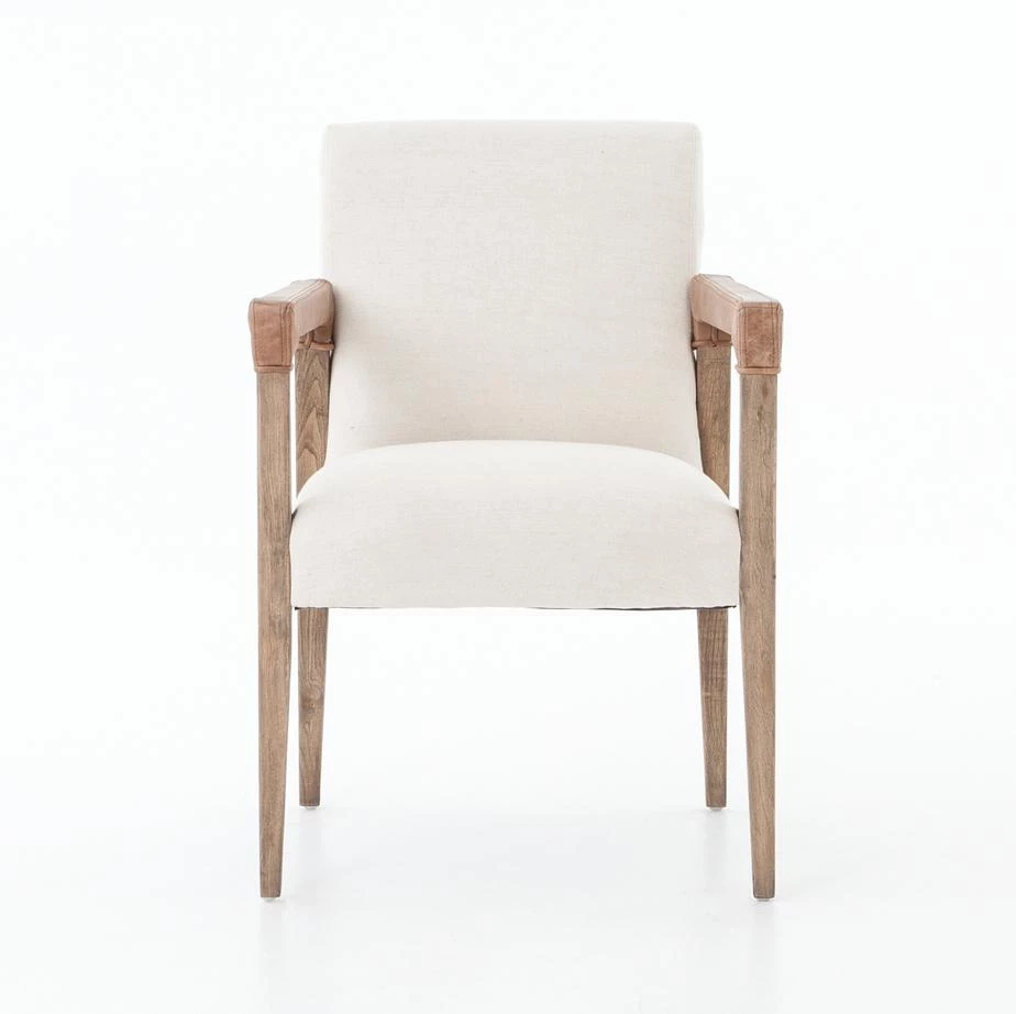 Elegance is no exaggeration. Slim, tapered oak with arms wrapped in vintage leather frames a floating seat covered in natural linen.