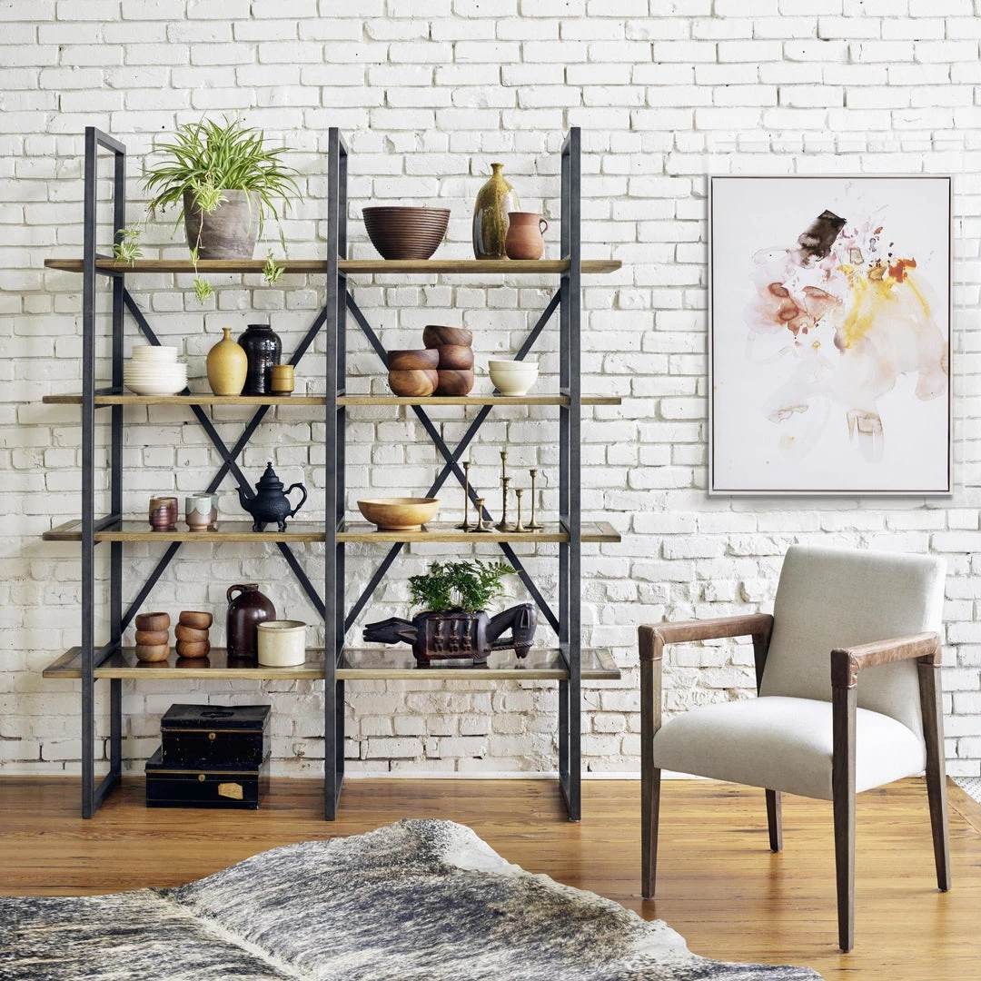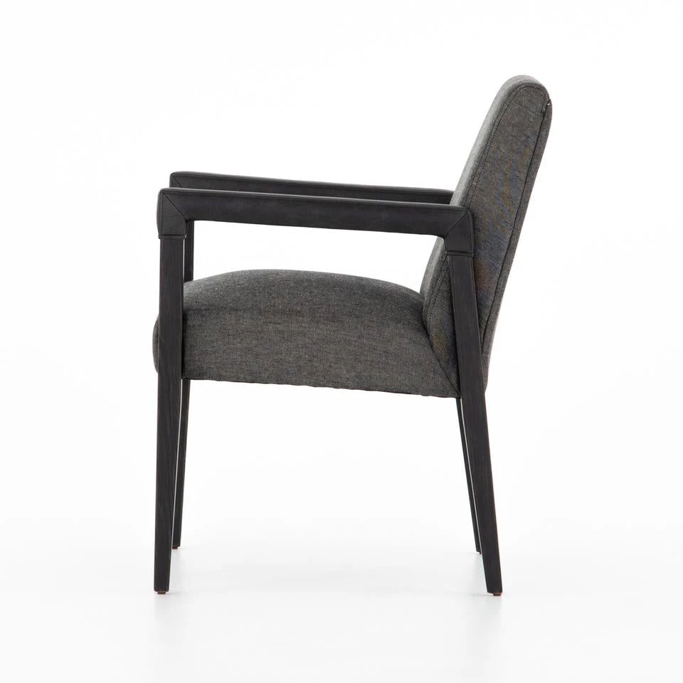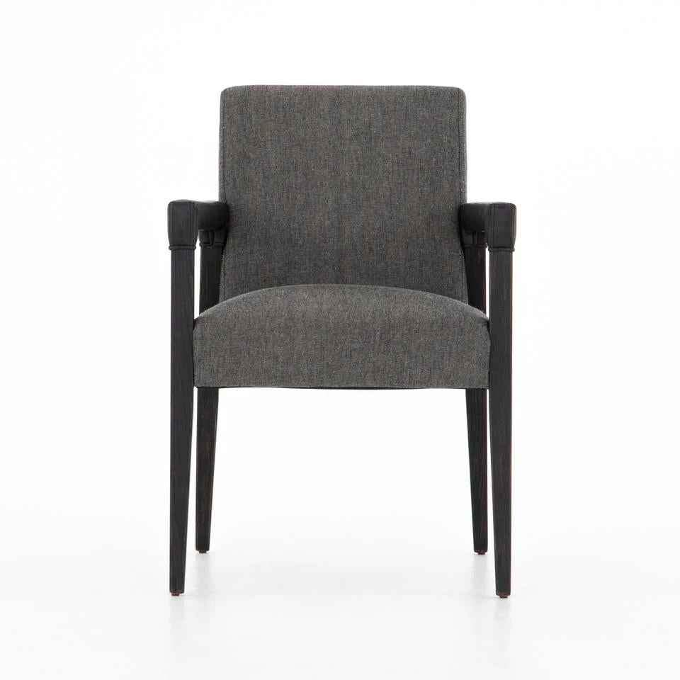 Elegance is no exaggeration. Slim, tapered oak with arms wrapped in vintage leather frames a floating seat covered in natural linen.