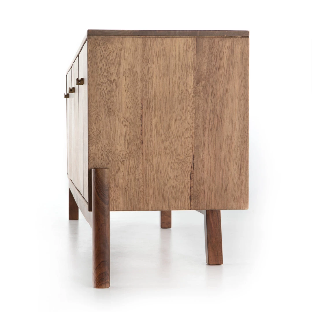 Mid-century styling with a Shaker spirit. Finished in a light, smoked honey, a clean-lined parawood console sits in an arched cradle base of toasted acacia, for fresh contrast. Twist-lock metal hardware adds a clever finishing touch. Rear cutouts for media cord management.