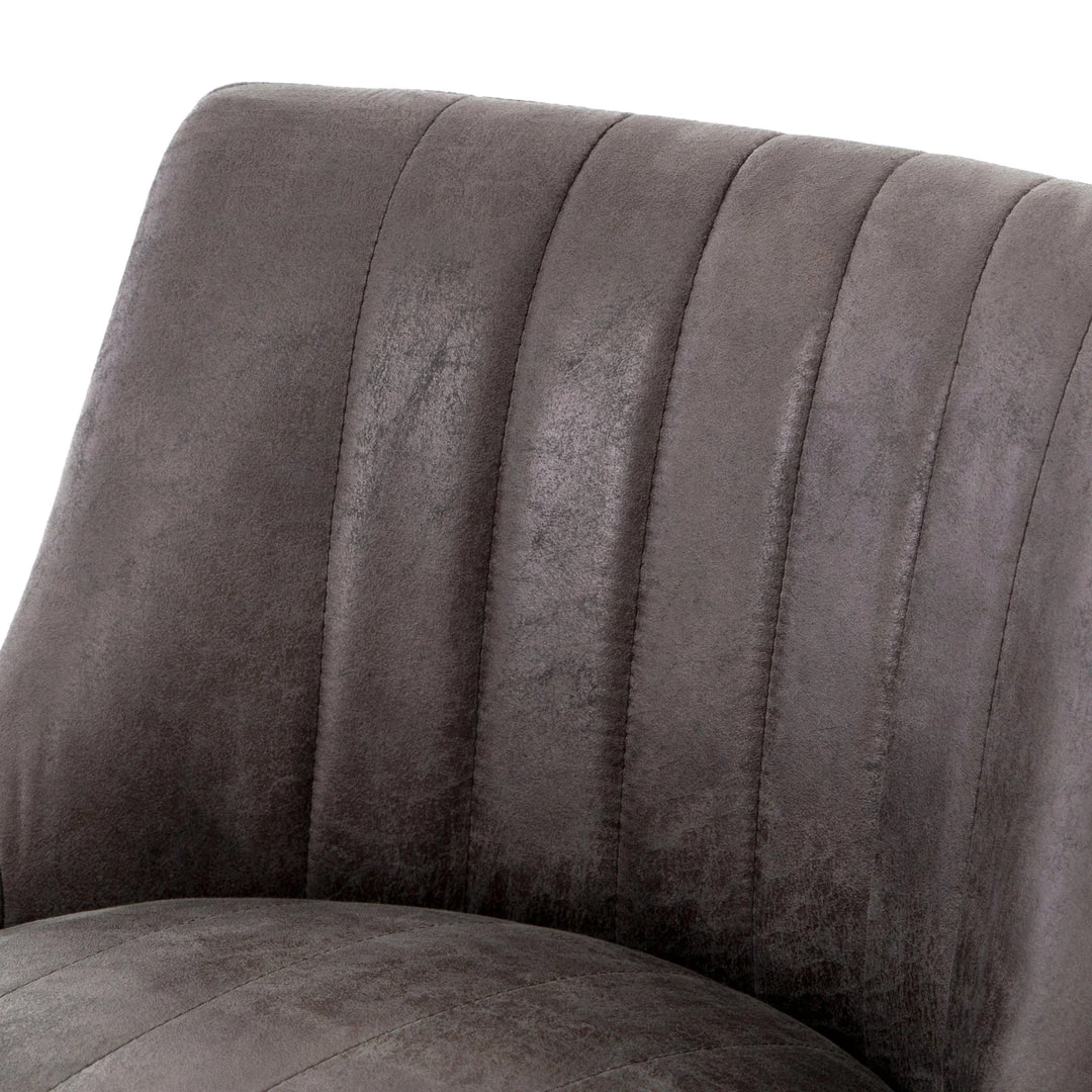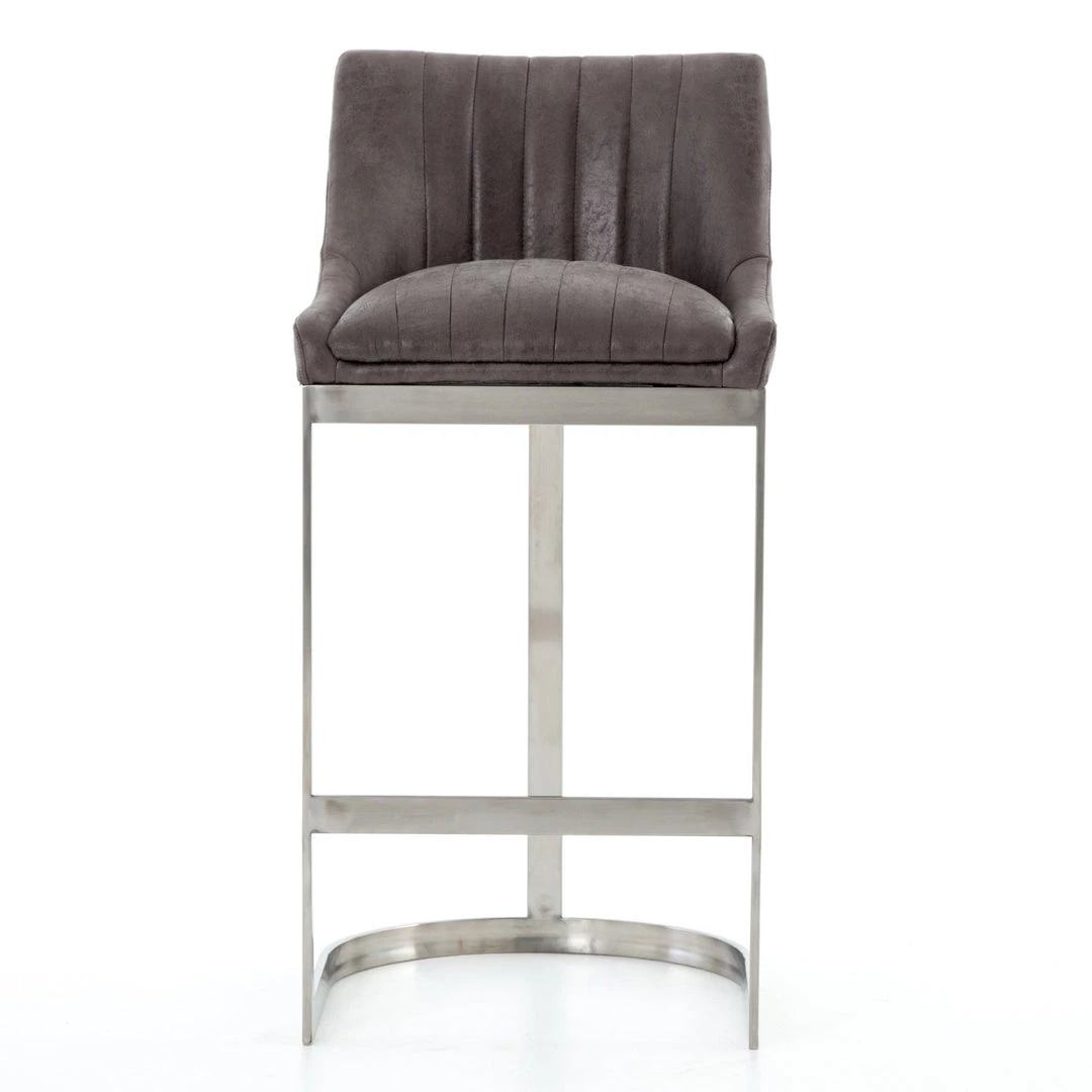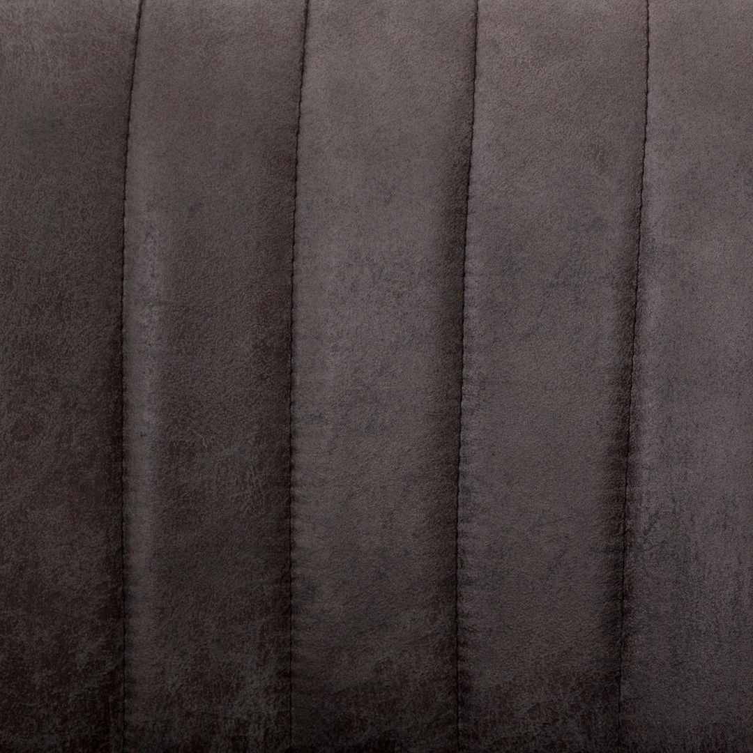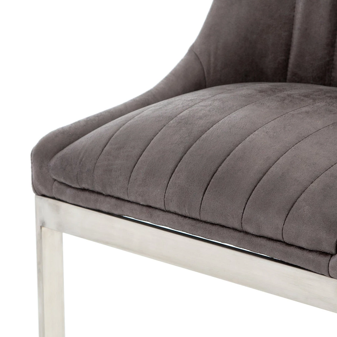 Vintage glamour gains modern presence. Stainless steel legs shape a classic U base. Rich faux leather adopts a graphite tone to welcome dramatic vertical channel tufting — the perfect pairing of throwback lounge style and fresh sophistication.