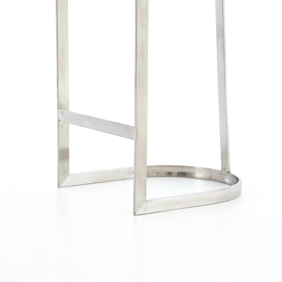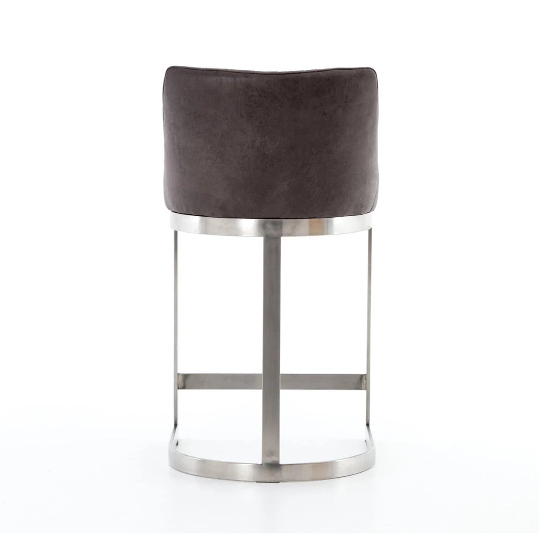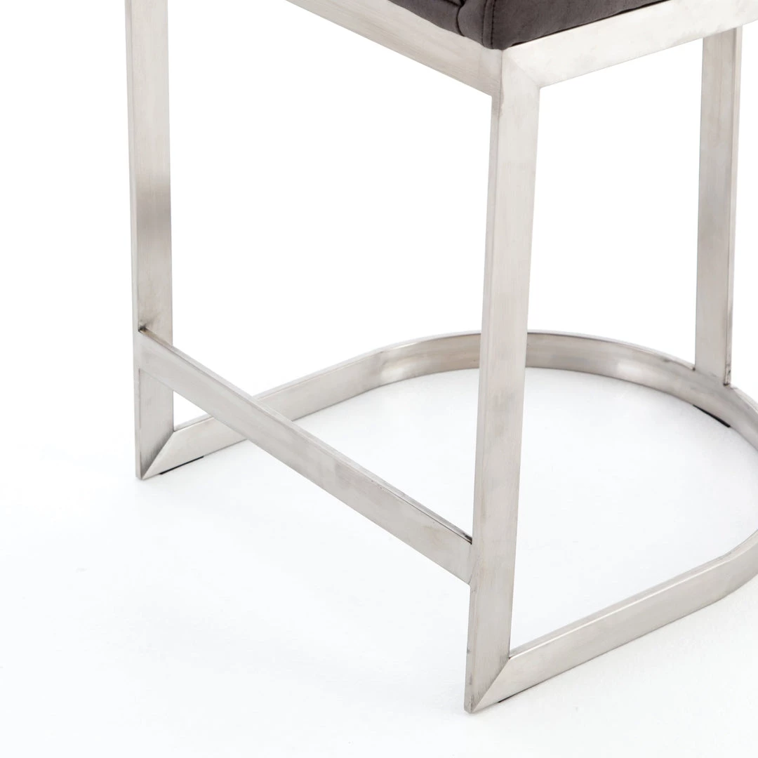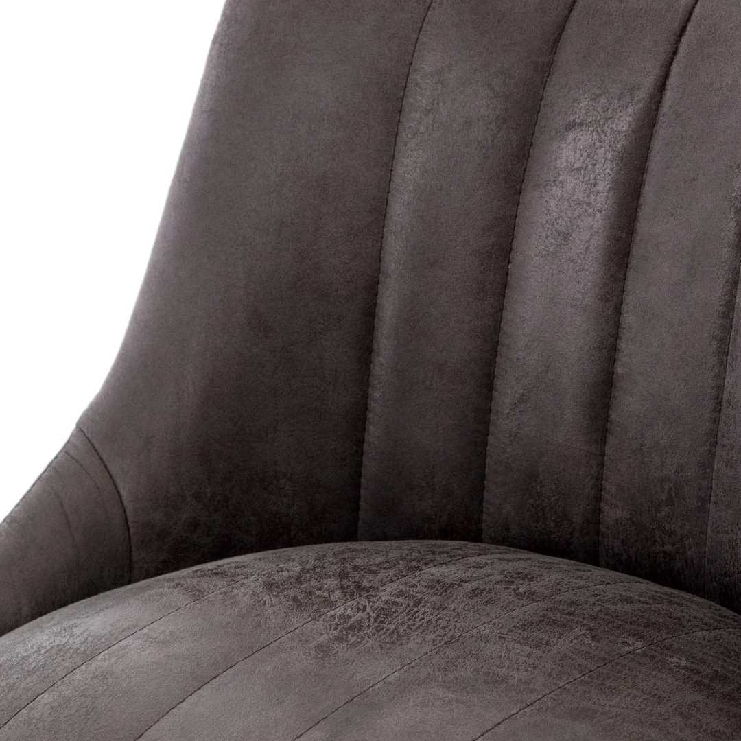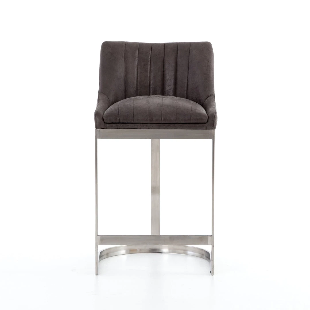 Vintage glamour gains modern presence. Stainless steel legs shape a classic U base. Rich faux leather adopts a graphite tone to welcome dramatic vertical channel tufting — the perfect pairing of throwback lounge style and fresh sophistication.