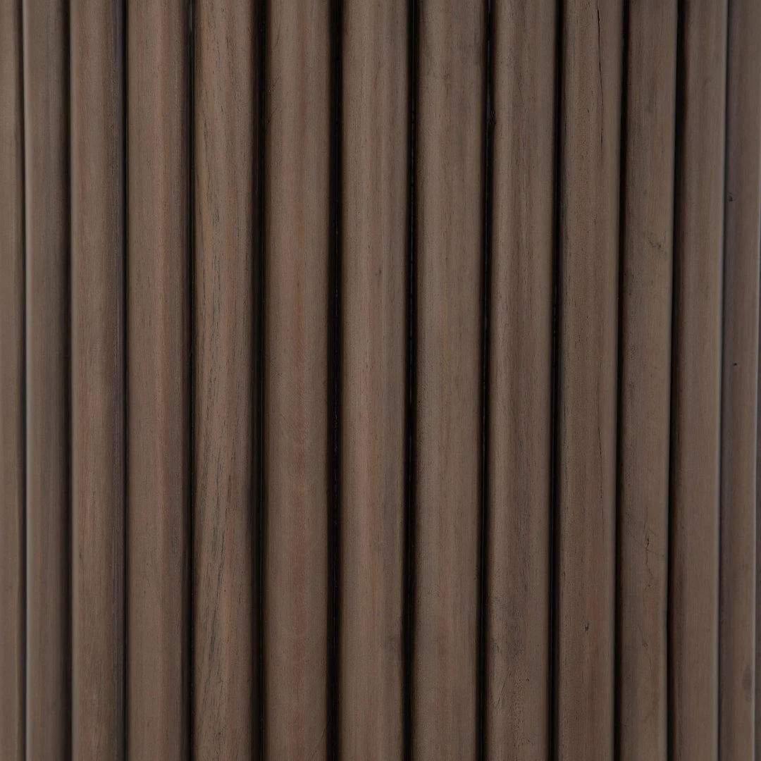 Inspired by décor in the majestic palaces of Jaipur, a conversation-starting end table is made from mixed reclaimed woods, with a rounded top and base with vertical reeding.