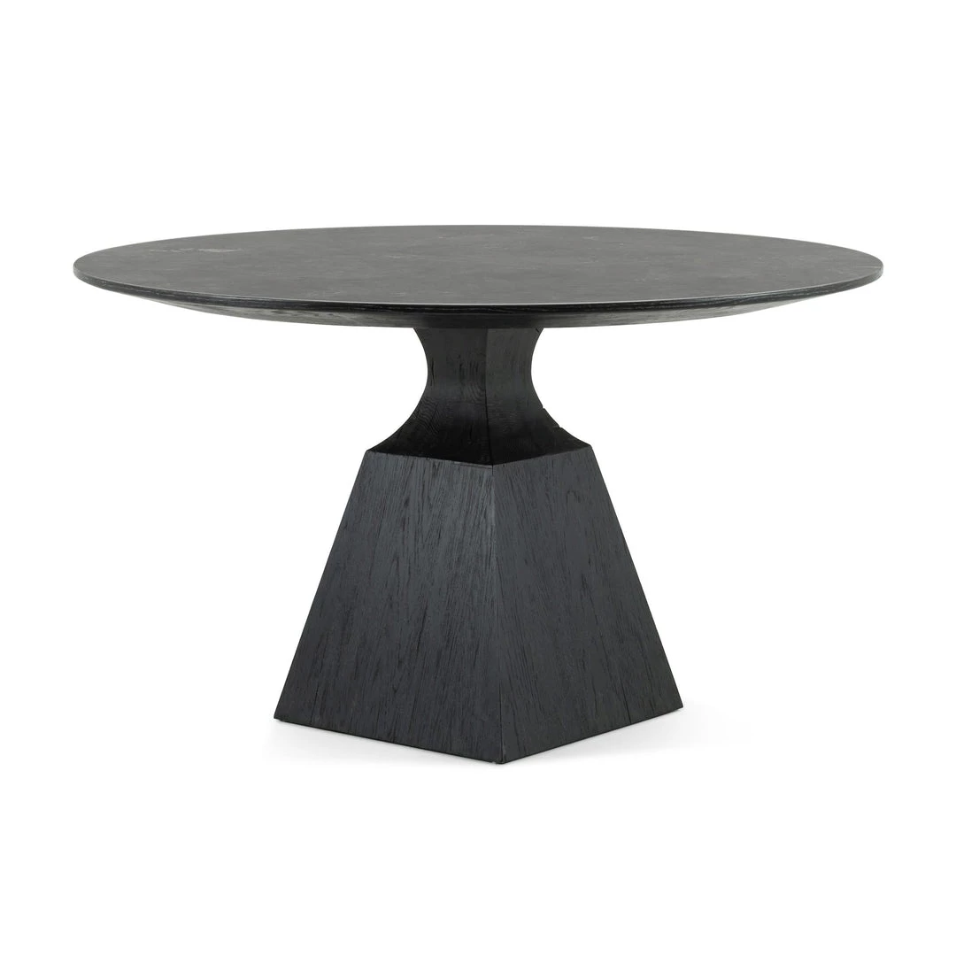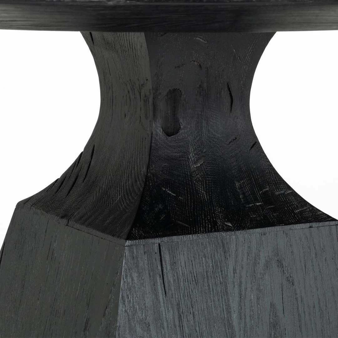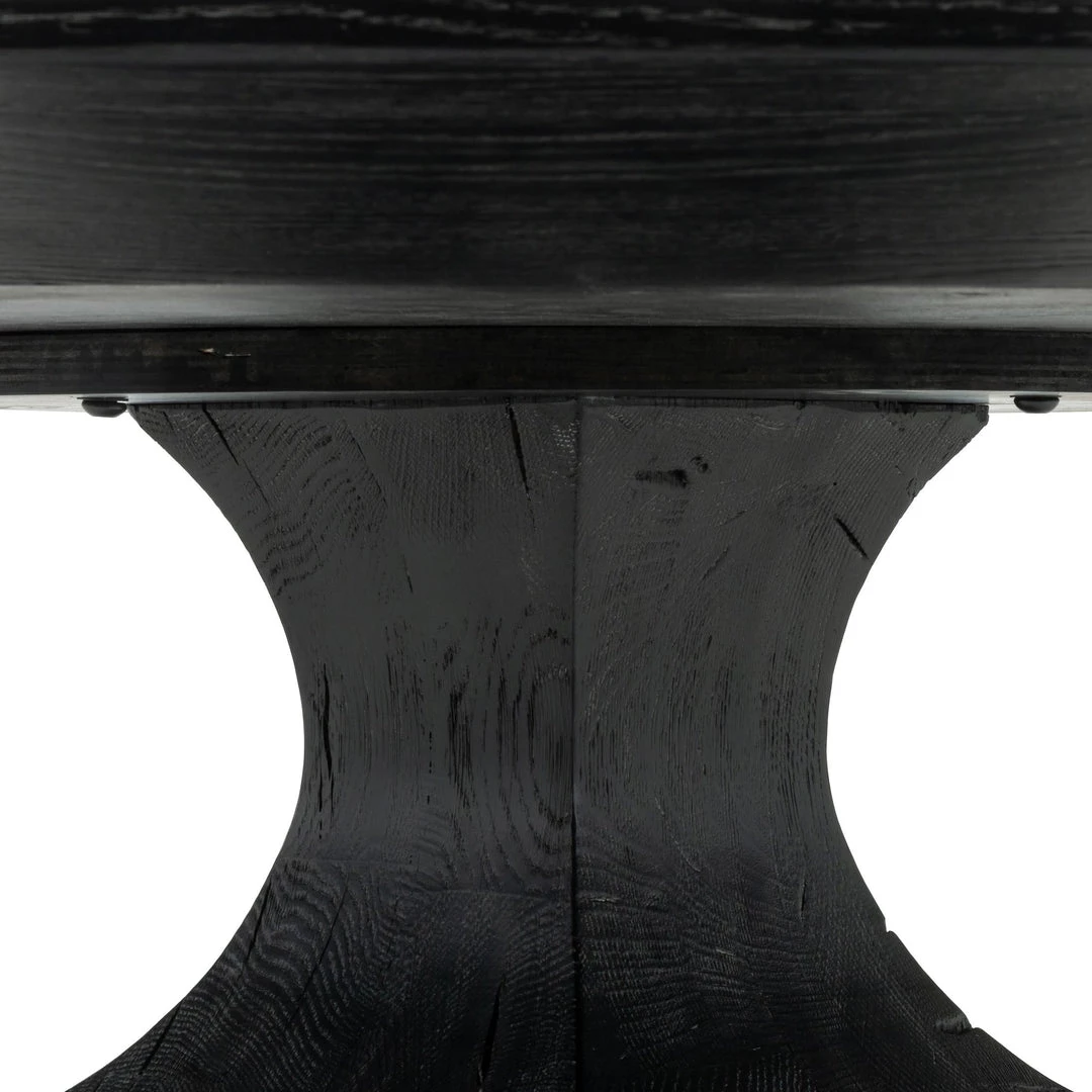 A bell-shaped pedestal base of black oak is wire-brushed for extra texture, while a rounded top of bluestone brings a touch of industrialism to the table.