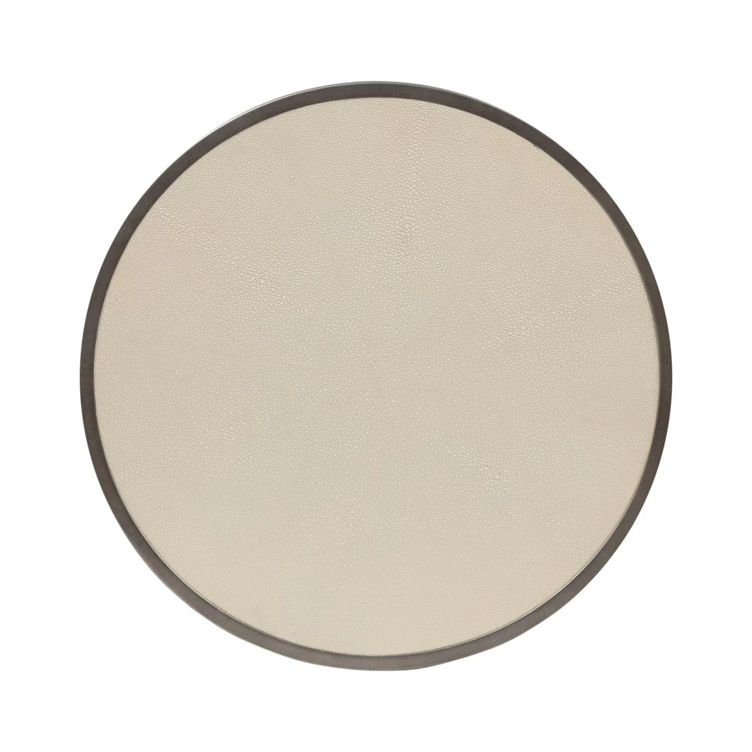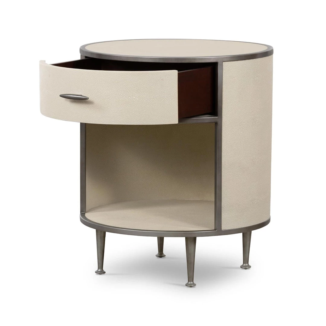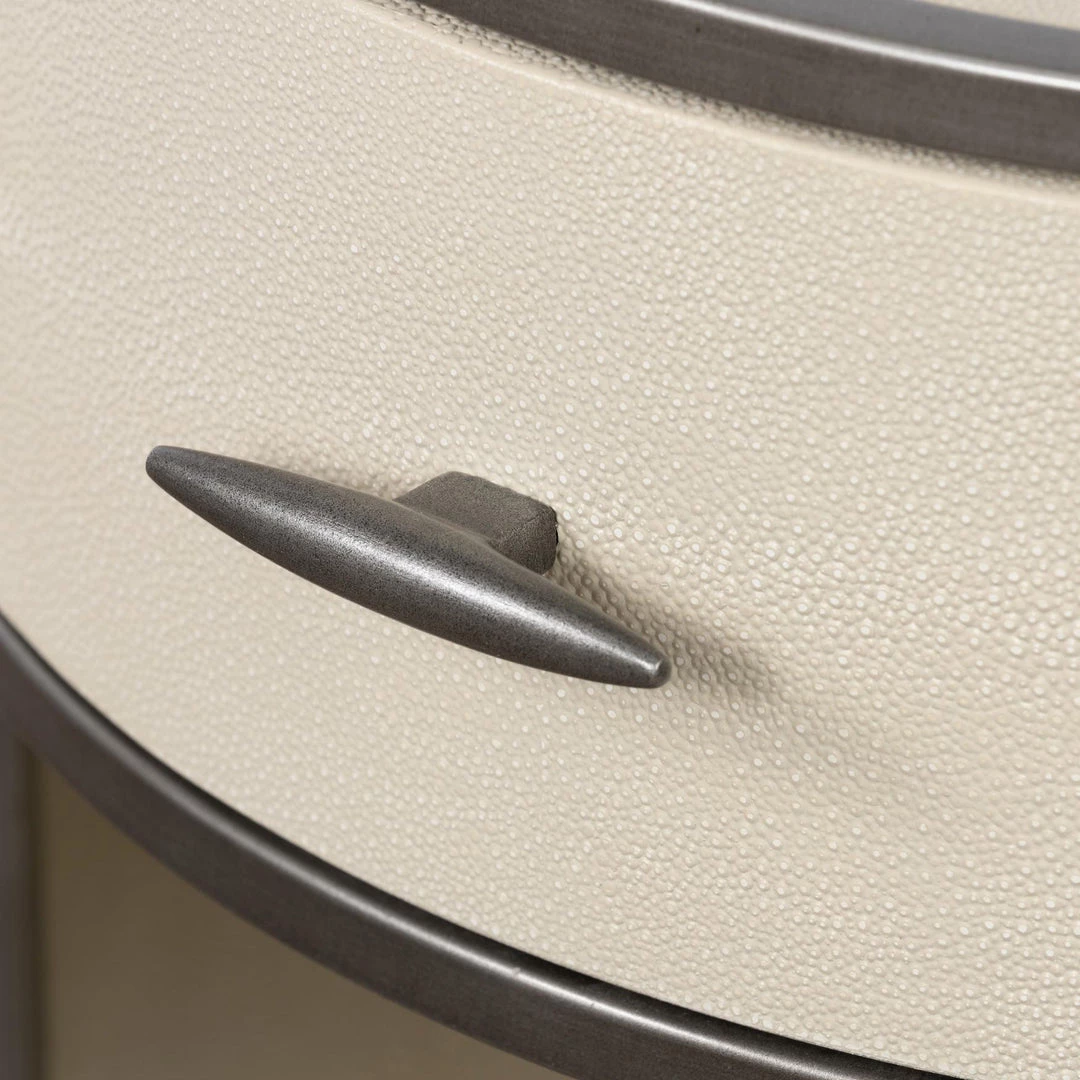 Mid-century shaping takes on new intrigue in a fresh grey faux shagreen. A perfectly curved bedside table with stainless steel accents and handy drawer storage.