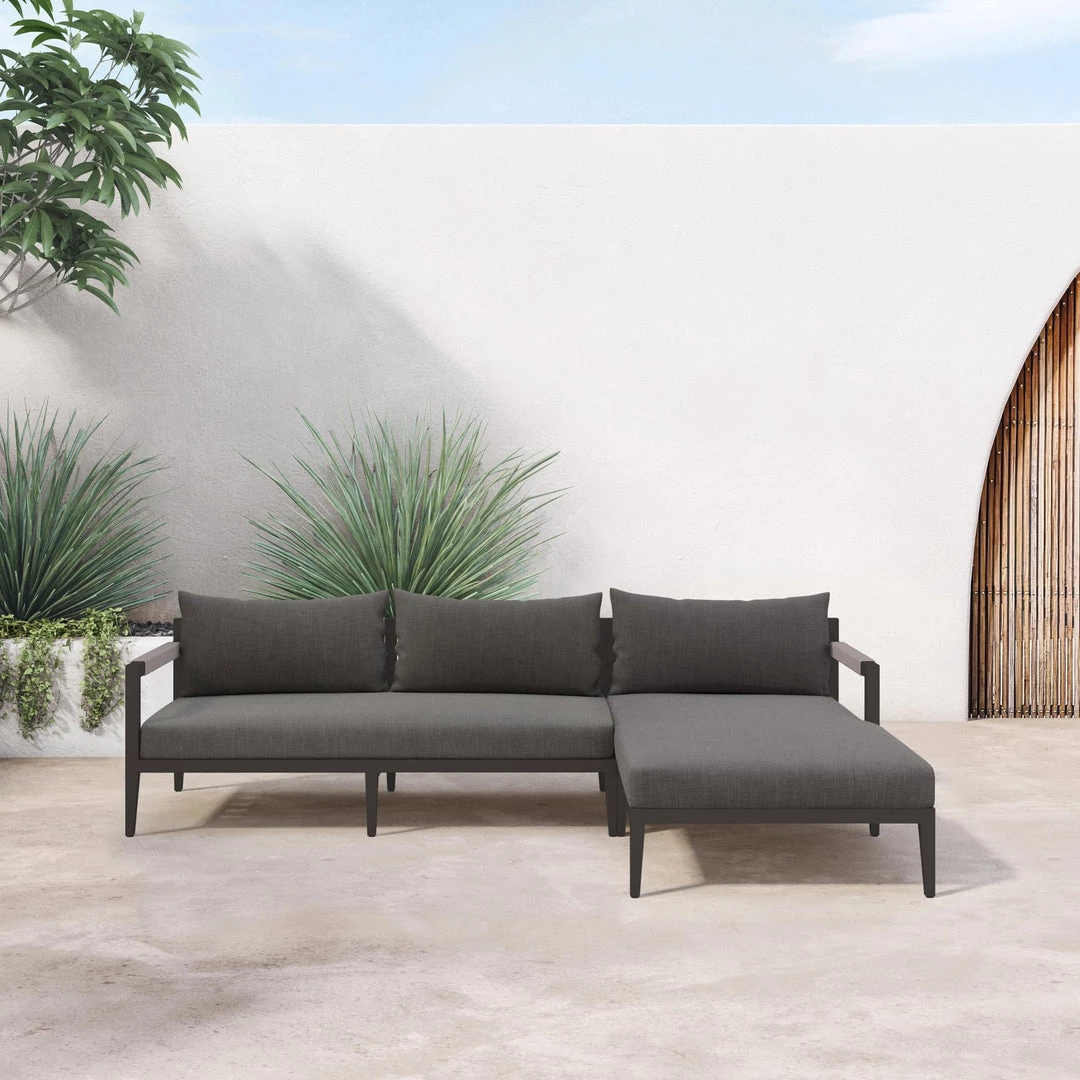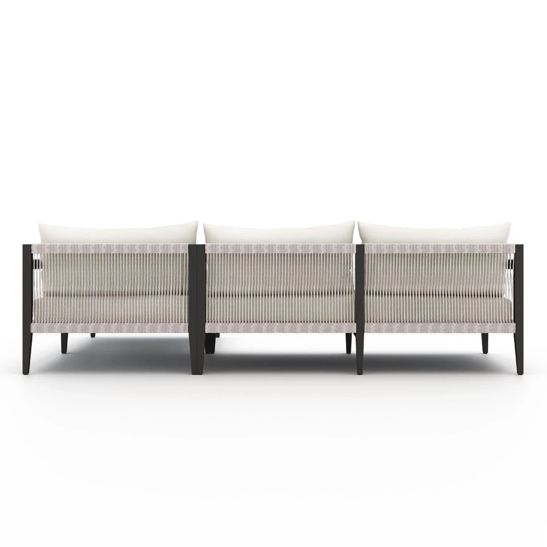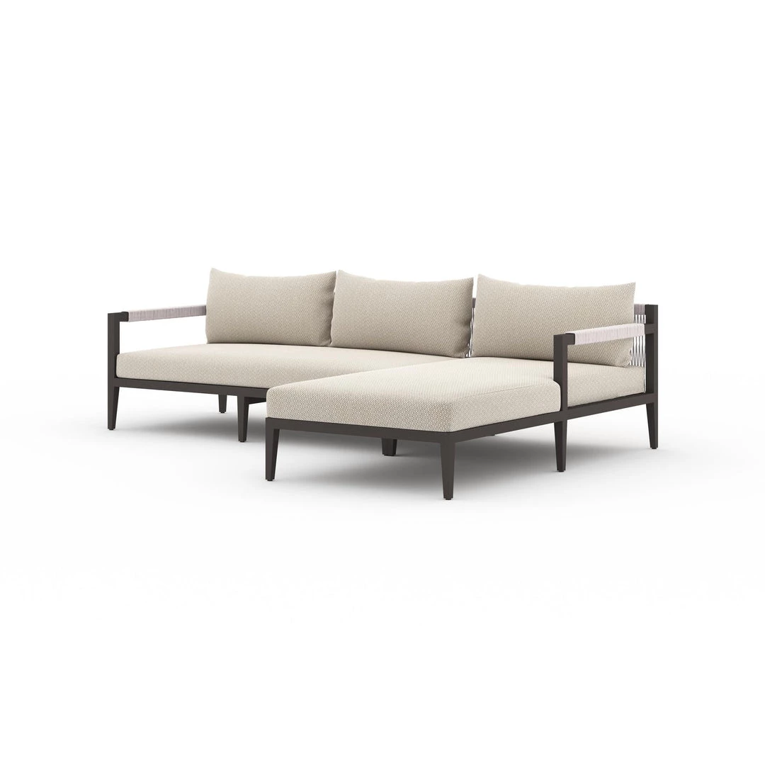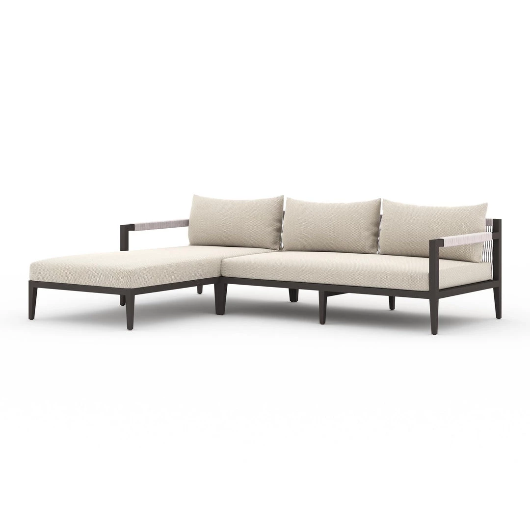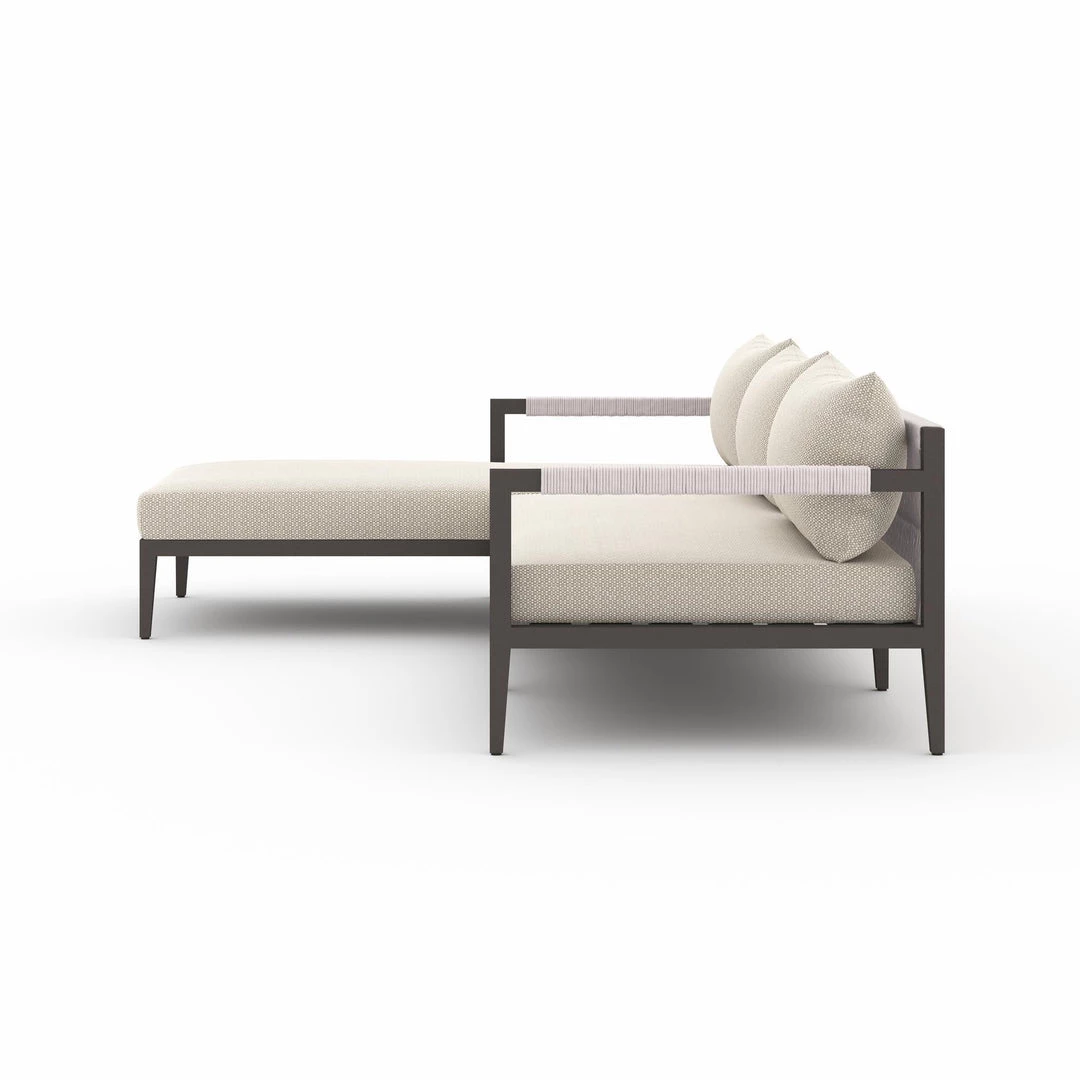 Modern materials ready a stylish silhouette for the outdoors. Bronze-finished aluminum forms a linear frame for UV-resistant and water-repellent Sunproof fabric in an inviting ivory. Rope-wrapped armrests and rear cotton weaving add a textured finishing touch. Right arm facing chaise sectional. Cover or store indoors during inclement weather.