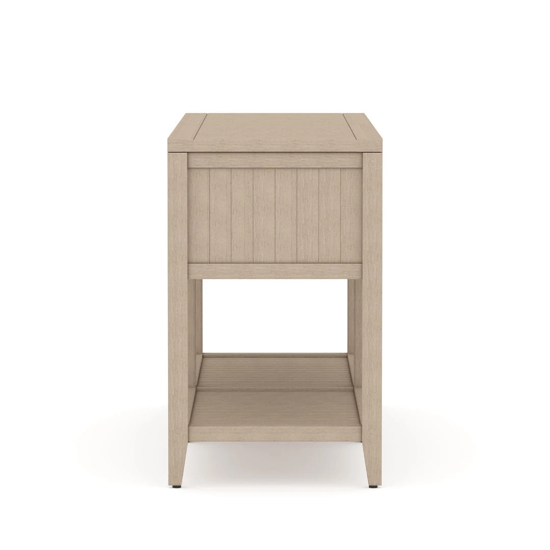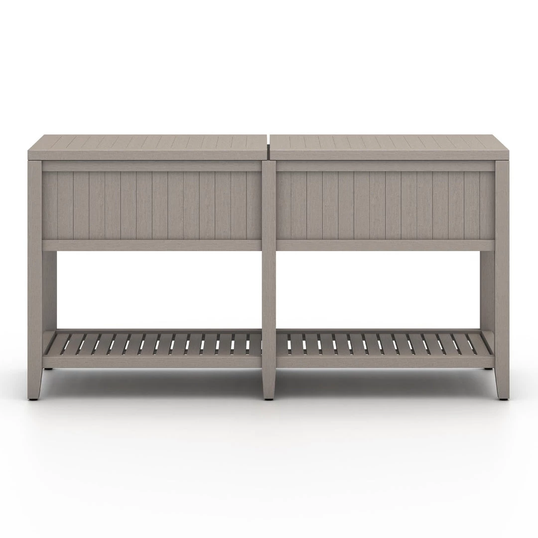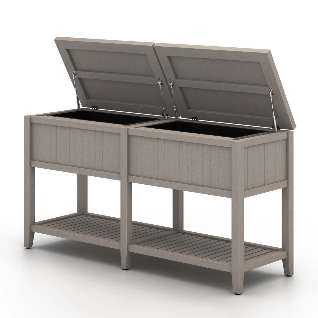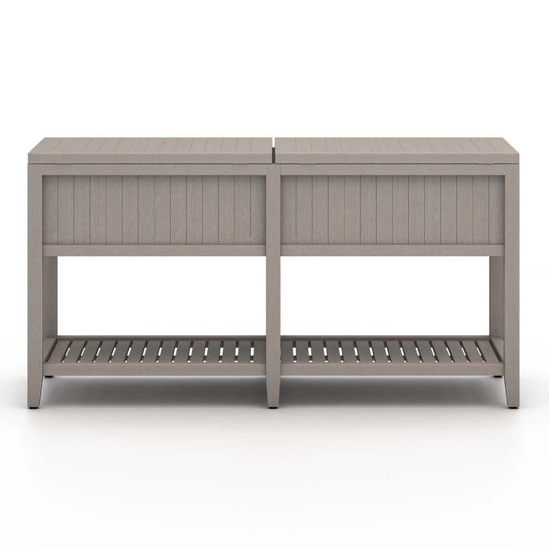 Take the party outside. Made from FSC-certified teak, this outdoor-friendly console brings storage and style to al fresco entertaining. Soft-close lid opens to reveal two aluminum buckets for ice and drinks. Buckets can also be removed, adding extra storage to this console. Cover or store inside during inclement weather and when not in use.