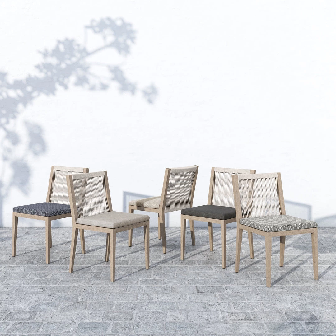 Dine in style, indoors and out. Solid FSC-certified teak framing features modern rope detailing and UV-resistant, water-repellent seat cushioning. Cover or store indoors during inclement weather and when not in use.