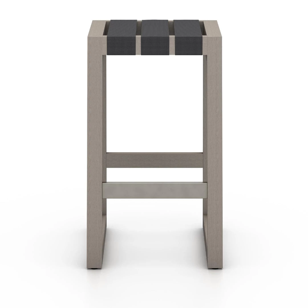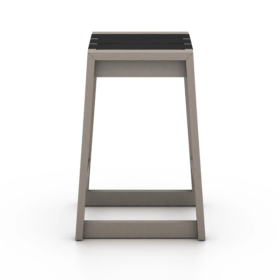 Pull up a stool and stay a while. FSC-certified teak forms an airy, angular frame, with kick plates for comfort plus strap seat detailing for textural intrigue. Cover or store indoors during inclement weather and when not in use.