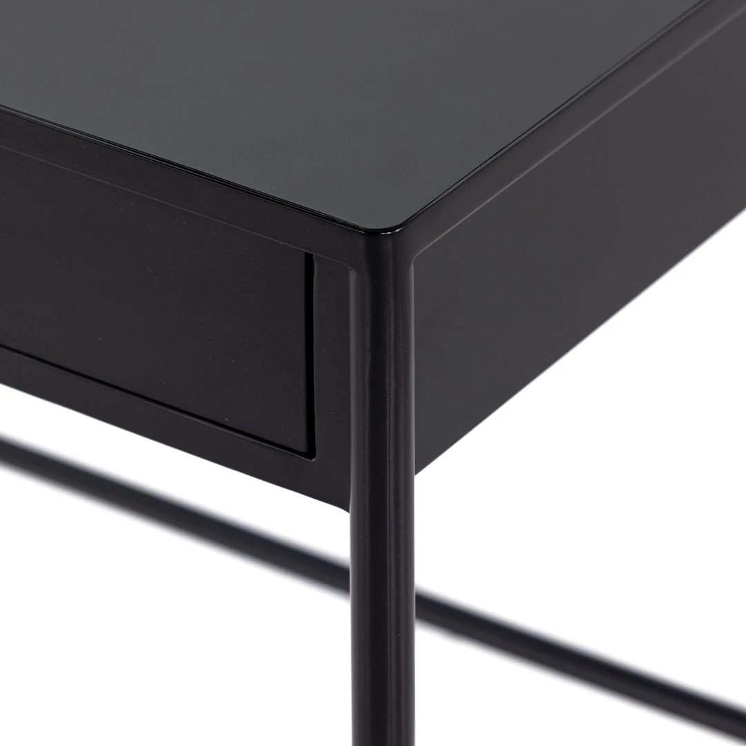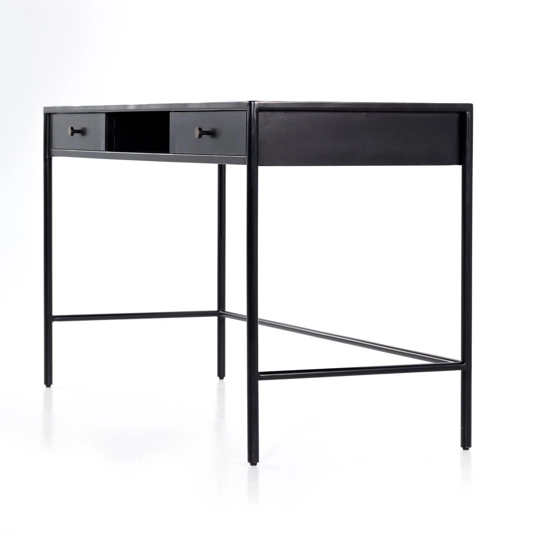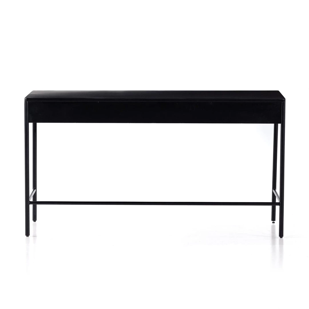 Slim and streamlined, with a touch of industrial edge. Made from black-finished iron with bronze-finished hardware and dual drawers for convenient storage.