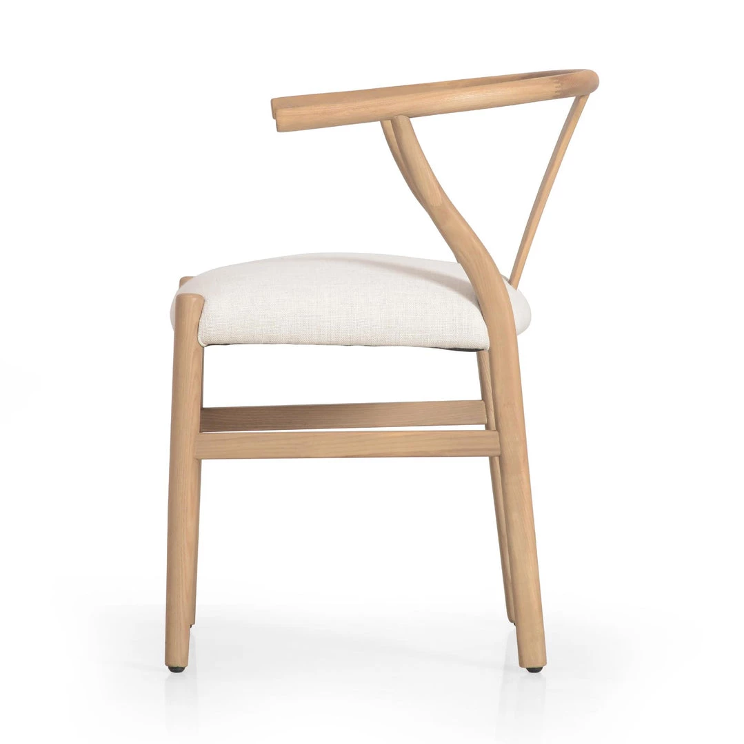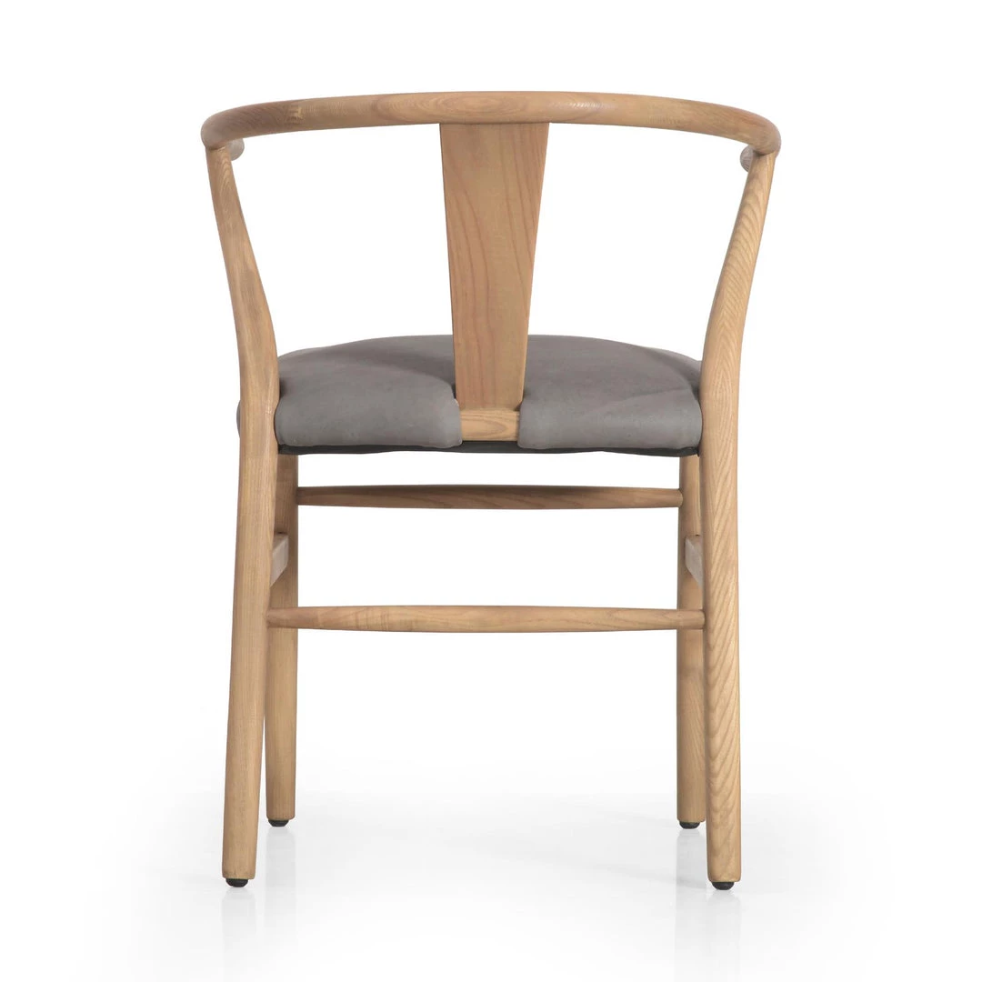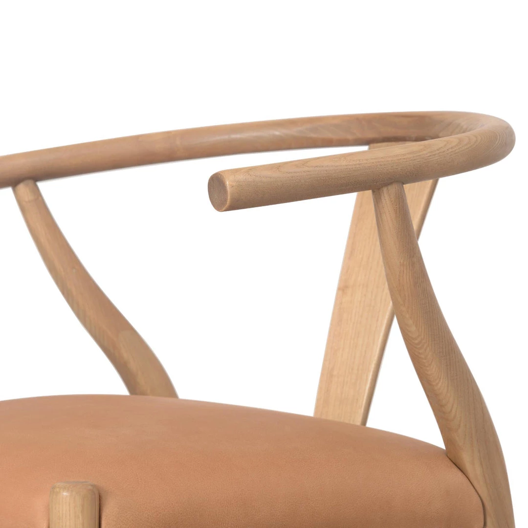 Pale-finished solid ash forms a classic wishbone-style frame for top-grain leather seating in a warm, modern camel.