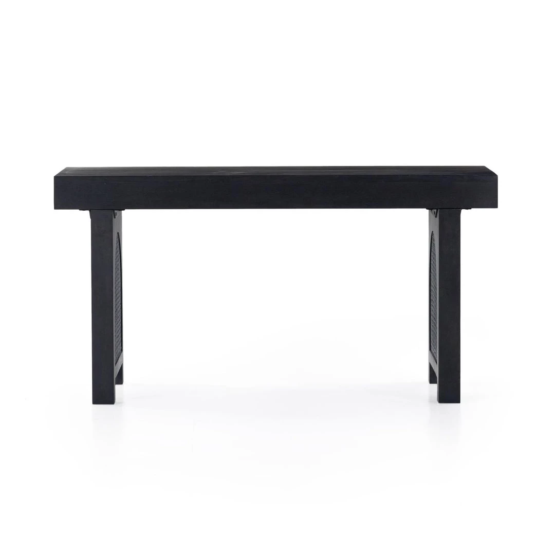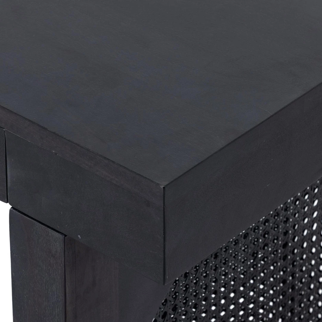 Black-washed mango encases textural cane door panels featuring black-finished iron hardware, meeting a forward-thinking material mix with sleek monochromatic vibes. Dual drawers keep frequently used office materials in close reach.