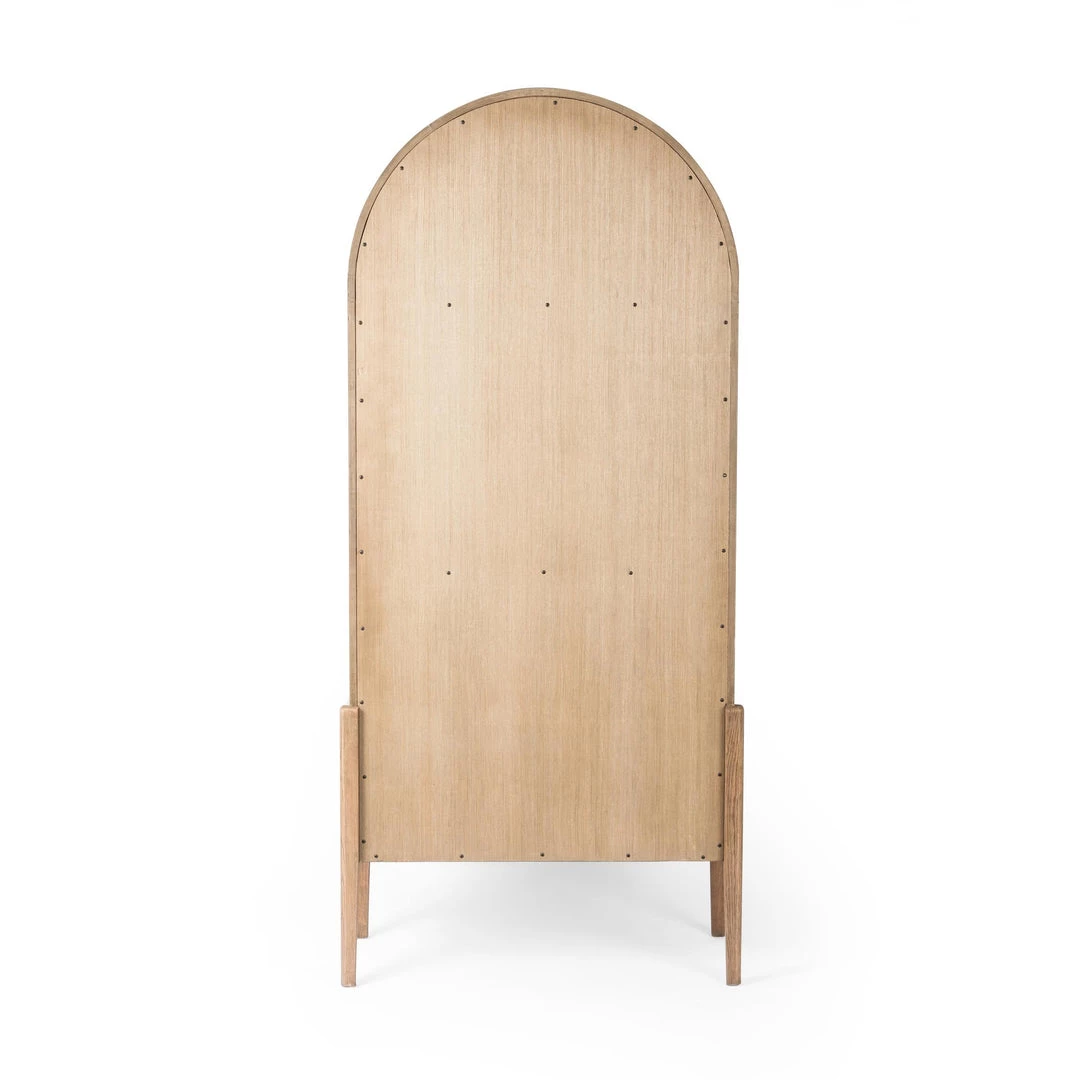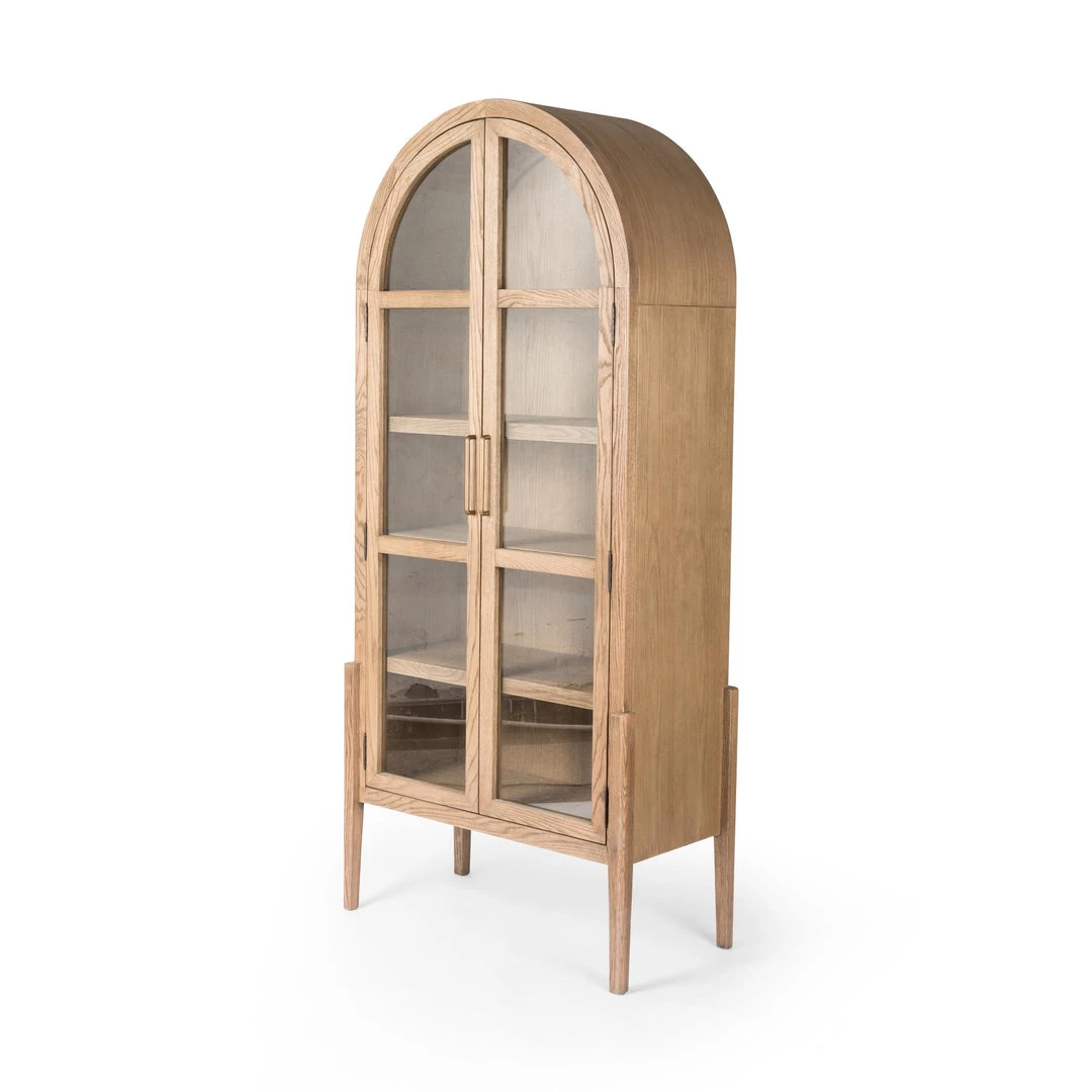 Store it in style. Beautifully shaped cabinetry of black solid oak features spacious interior shelving and clear glass front, ready for displaying favorite books, photos and treasures.