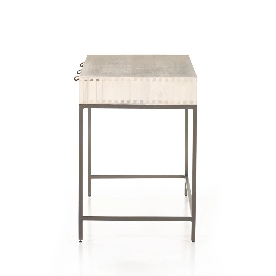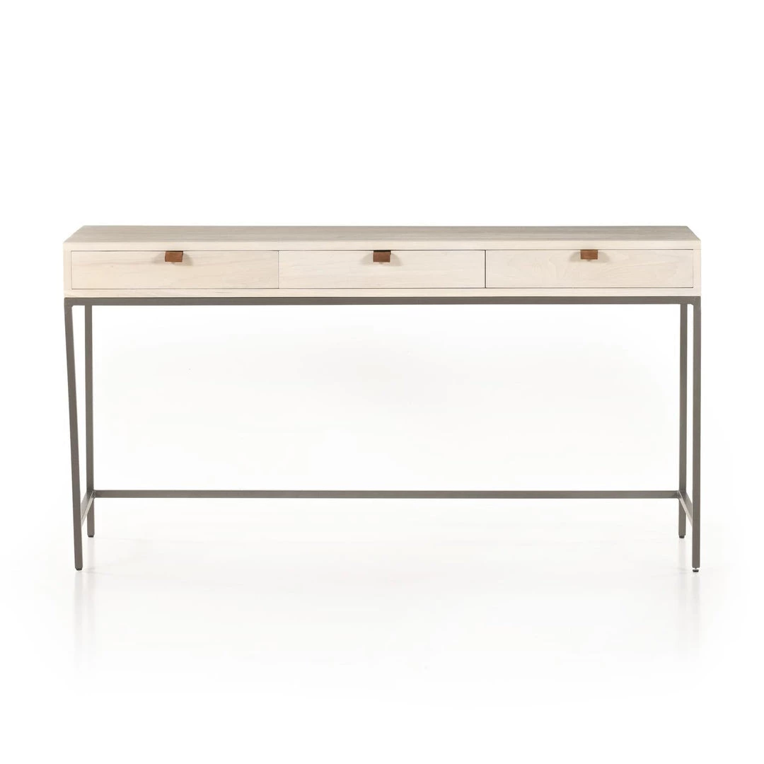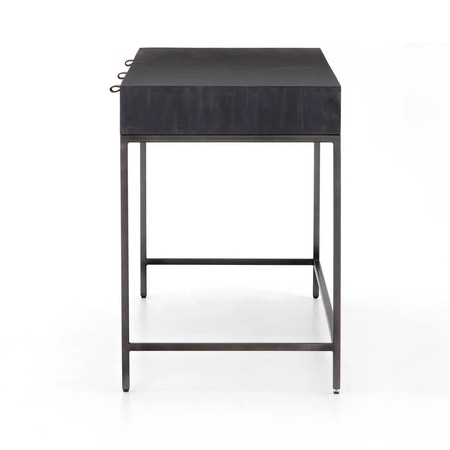 Inspired by clean mid-century design, greyish auburn poplar offers generous desk storage by way of three spacious drawers, with a fully finished back plus metal-secured leather pulls for an element of surprise. Great solo or paired with matching corner desk, file cabinet or credenza.