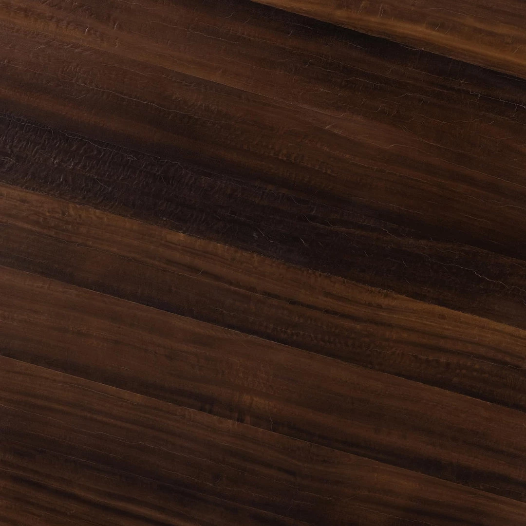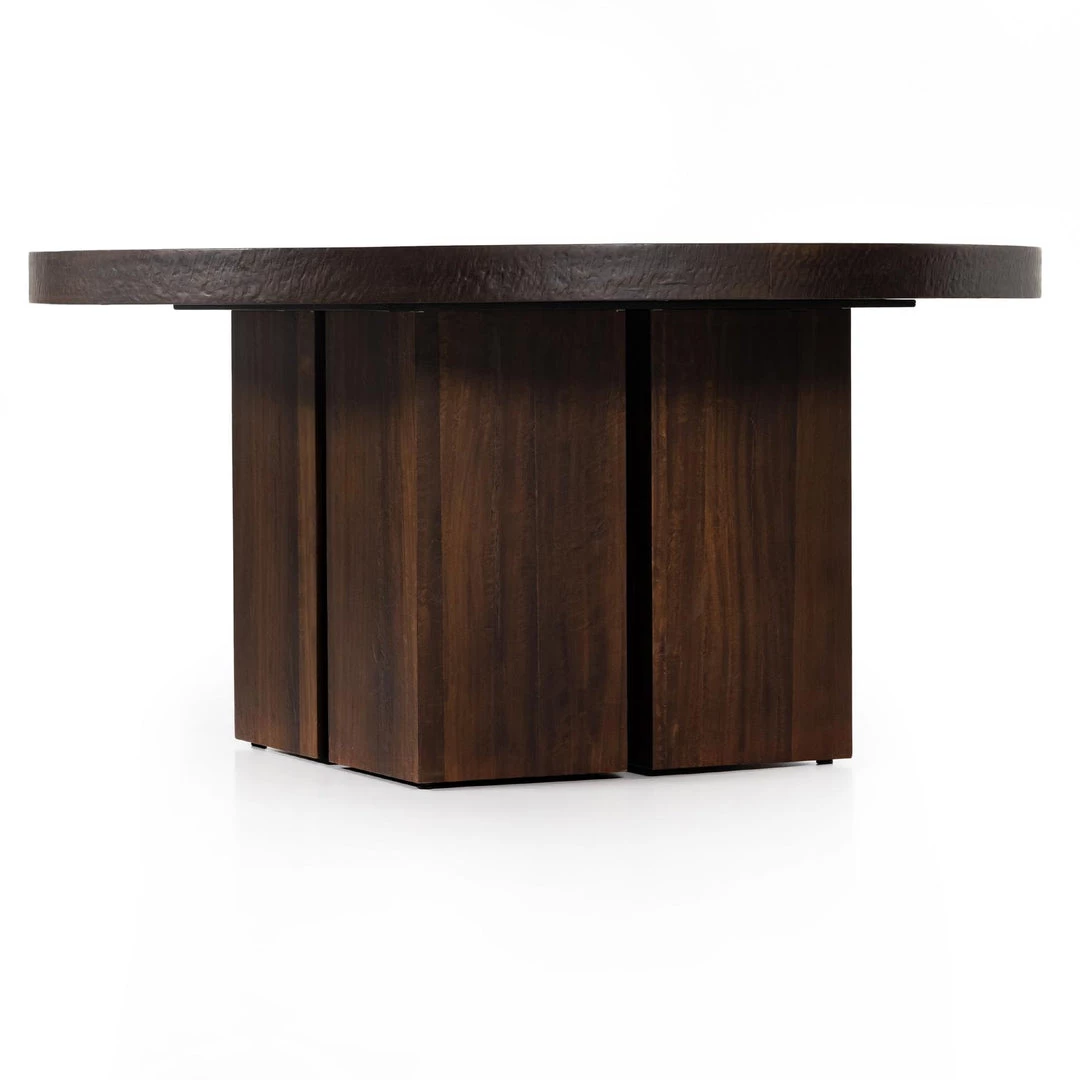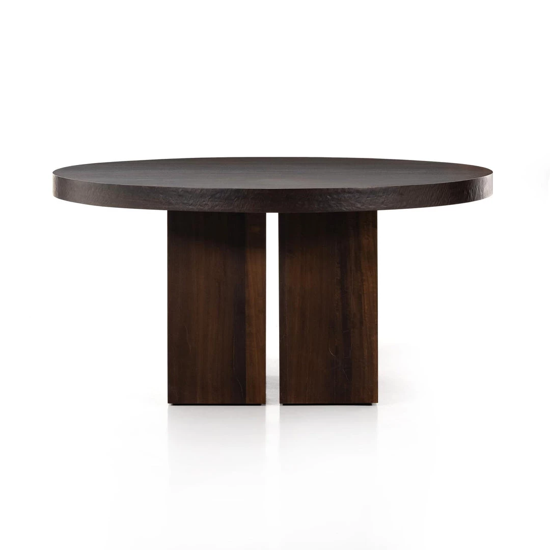 Made from eucalyptus veneer with striking highs and lows, an oversize pillar base grounds a rounded tabletop with a wavy grain and smoky tone. Seats six comfortably.