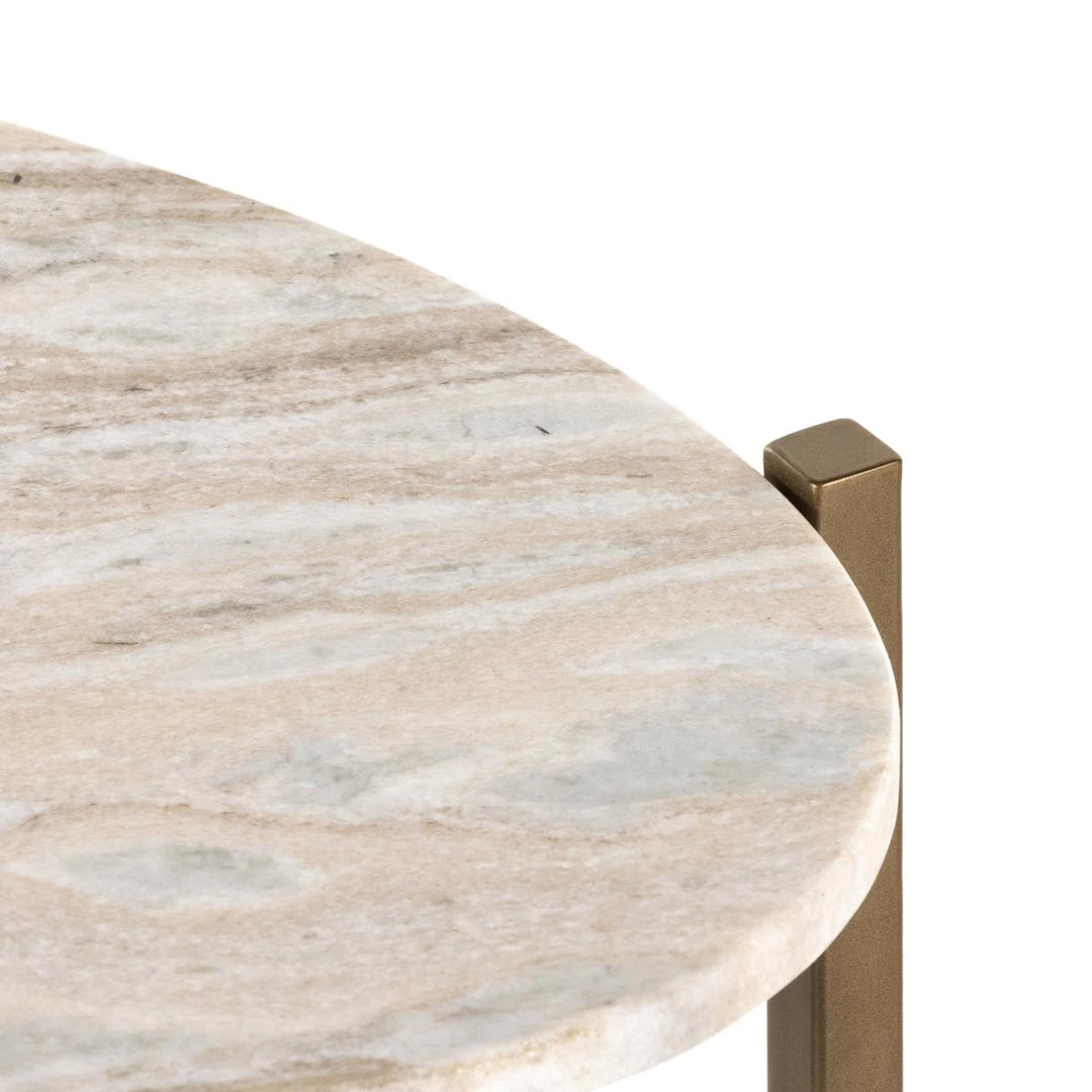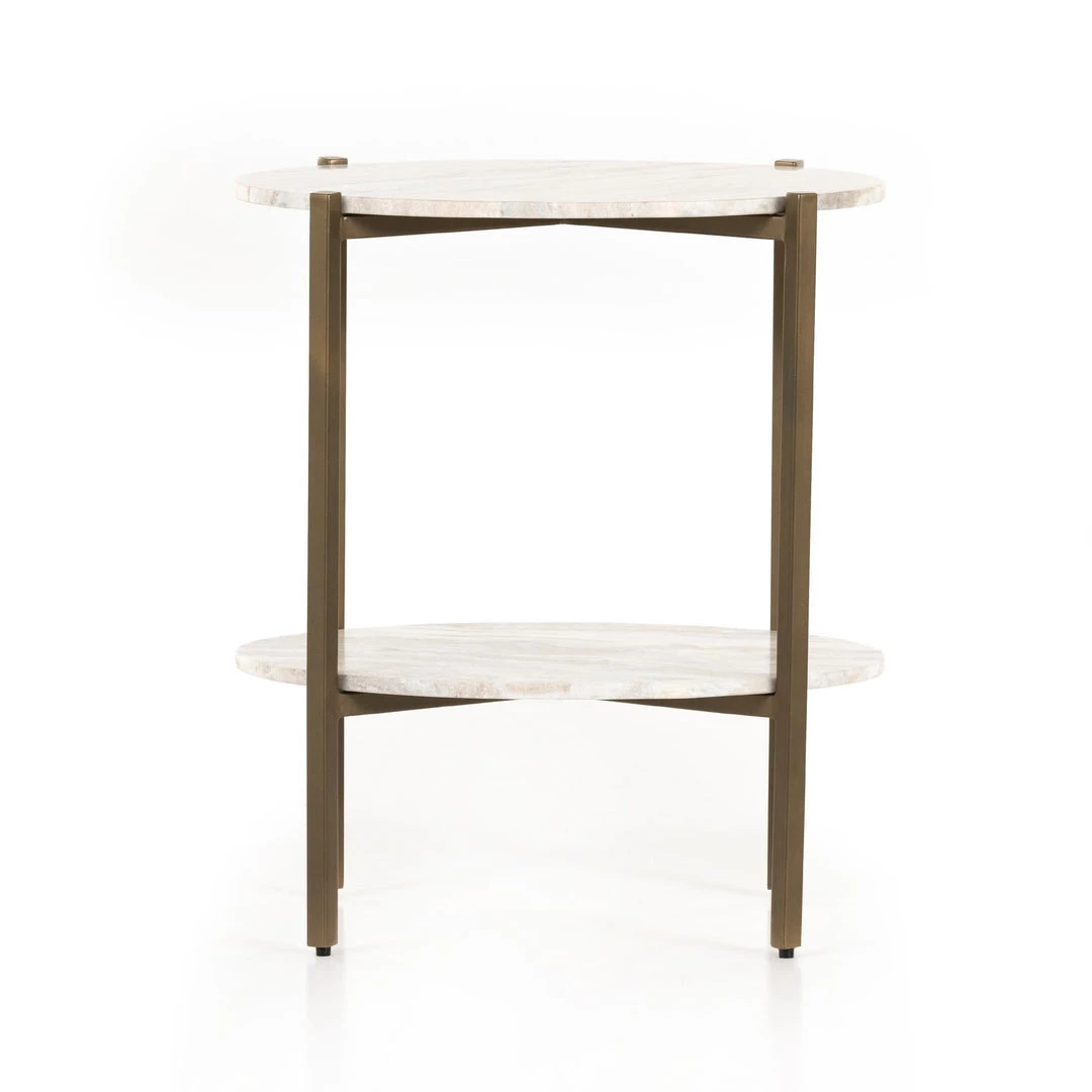 Mixed materials mean total elegance. An airy, dual-shelf nightstand features creamy taupe marble and slim iron framing finished in an antique brass.