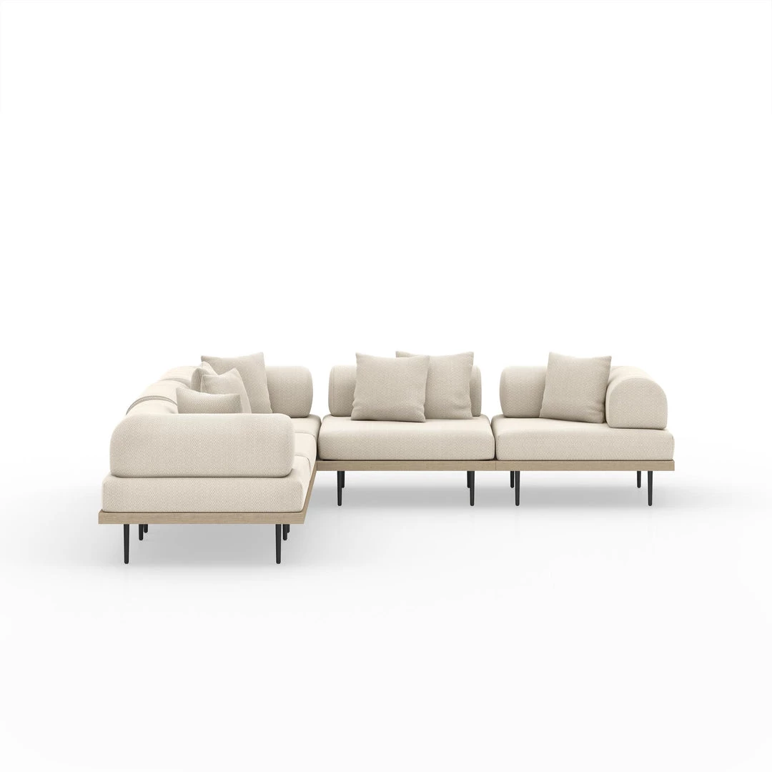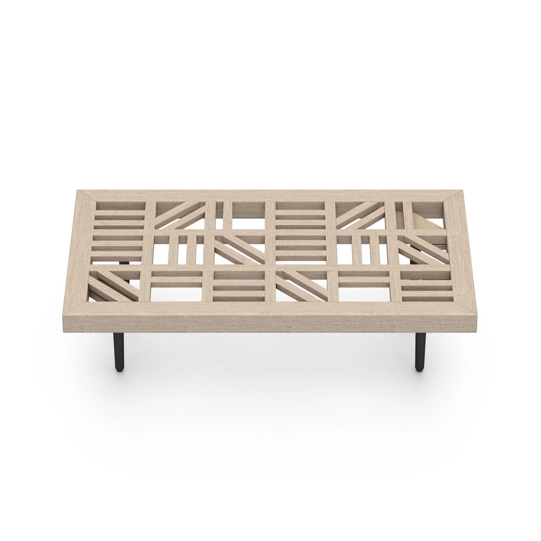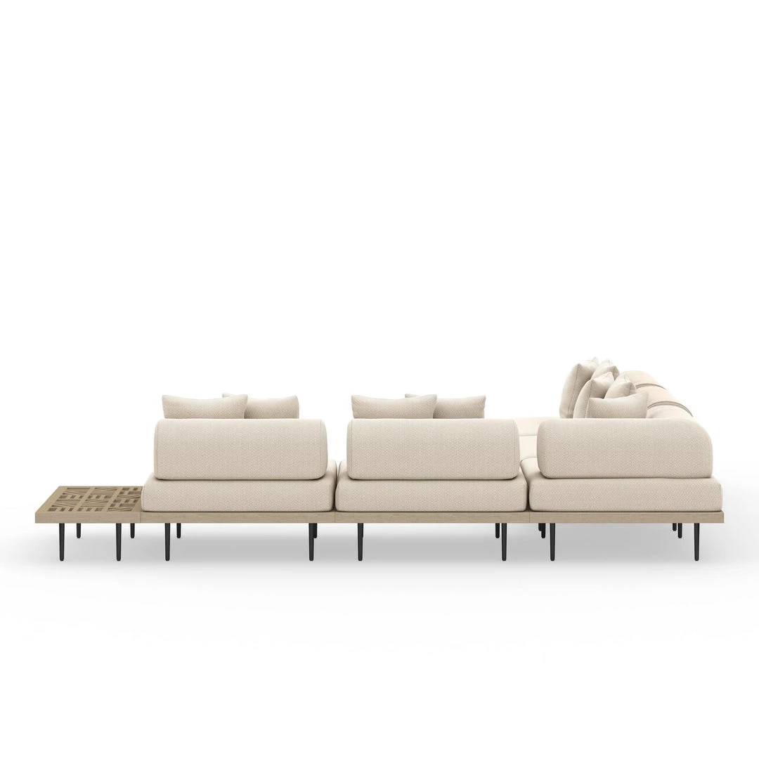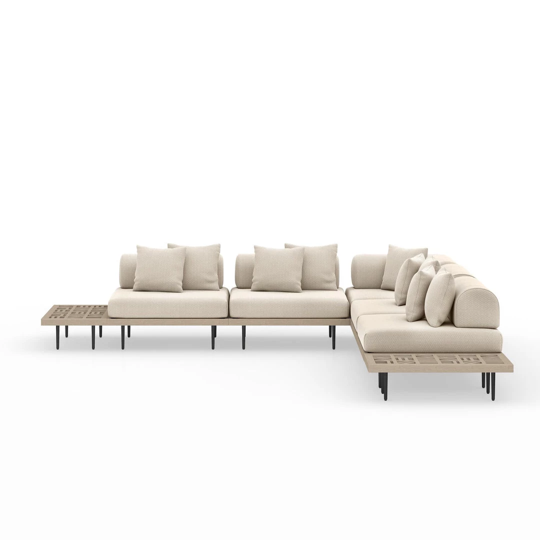 Adaptable entertaining, made for outdoors. Finished in a washed brown, FSC-certified teak frames durable, weather-resistant cushioning in a neutral sand, with comfy bolster arms for lounging. Low-sitting end table features a trellis pattern, for even-more texture. Cover or store indoors during inclement weather and when not in use.
