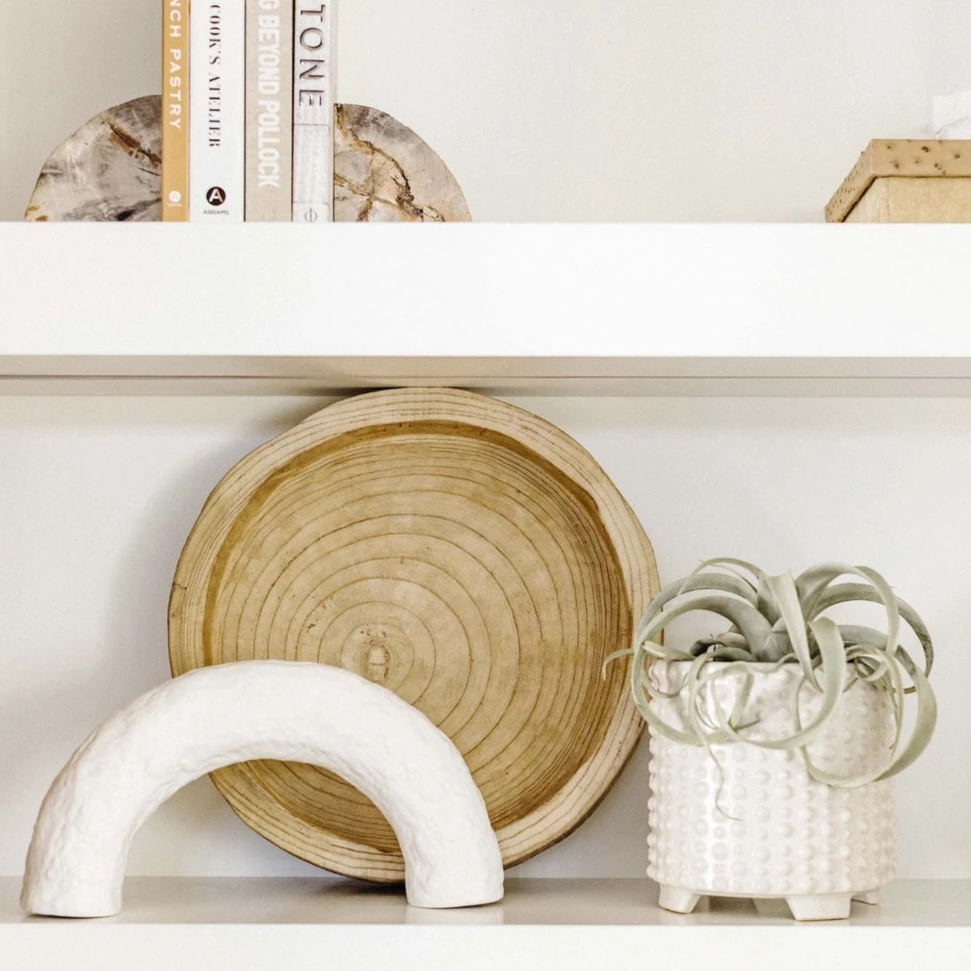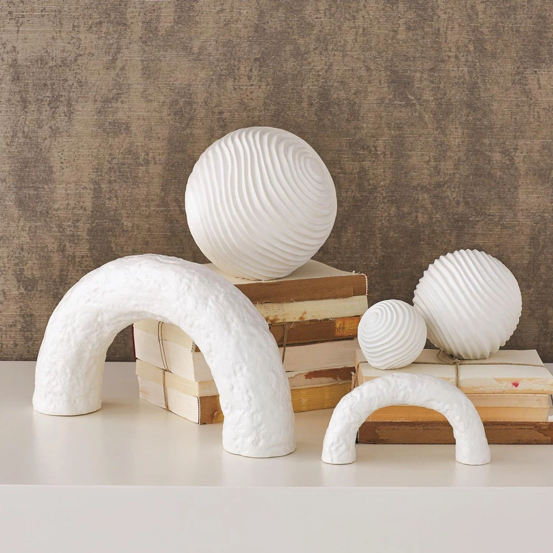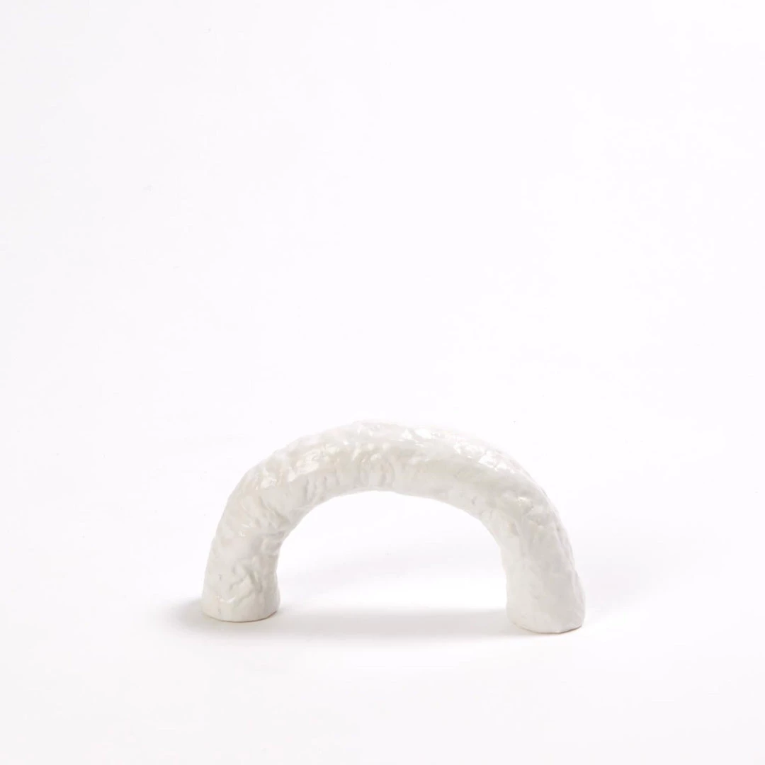 The Bree Arch references architecture, ancient aqueducts, and symbolic gateways in construction. They can be moved and styled to make beautiful shapes with the positive and negative space they create. Also, they work well in a collection to create a truly remarkable shelf to the tablescape. Made of ceramic in a white matte finish.