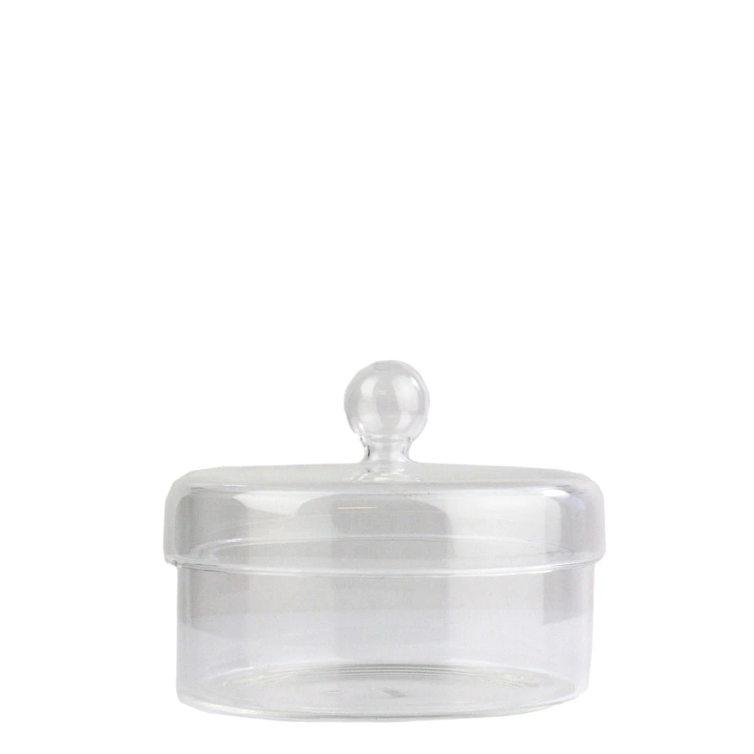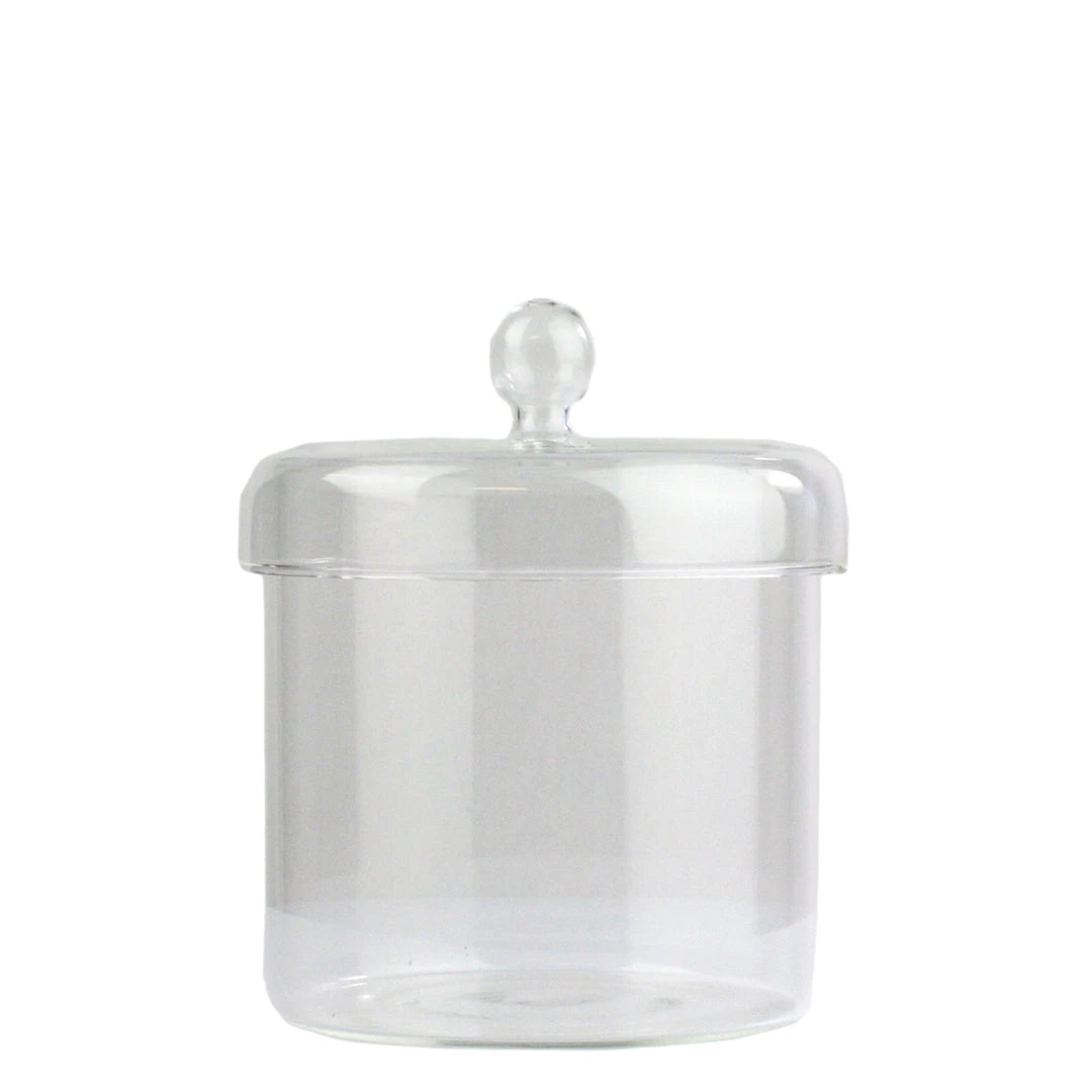 Glass Jars with Lids.  Available in Small and Large.  Can be used in kitchen for dry goods and in the bathroom for cotton balls or bath salts.  Include stoppers but are not air tight.