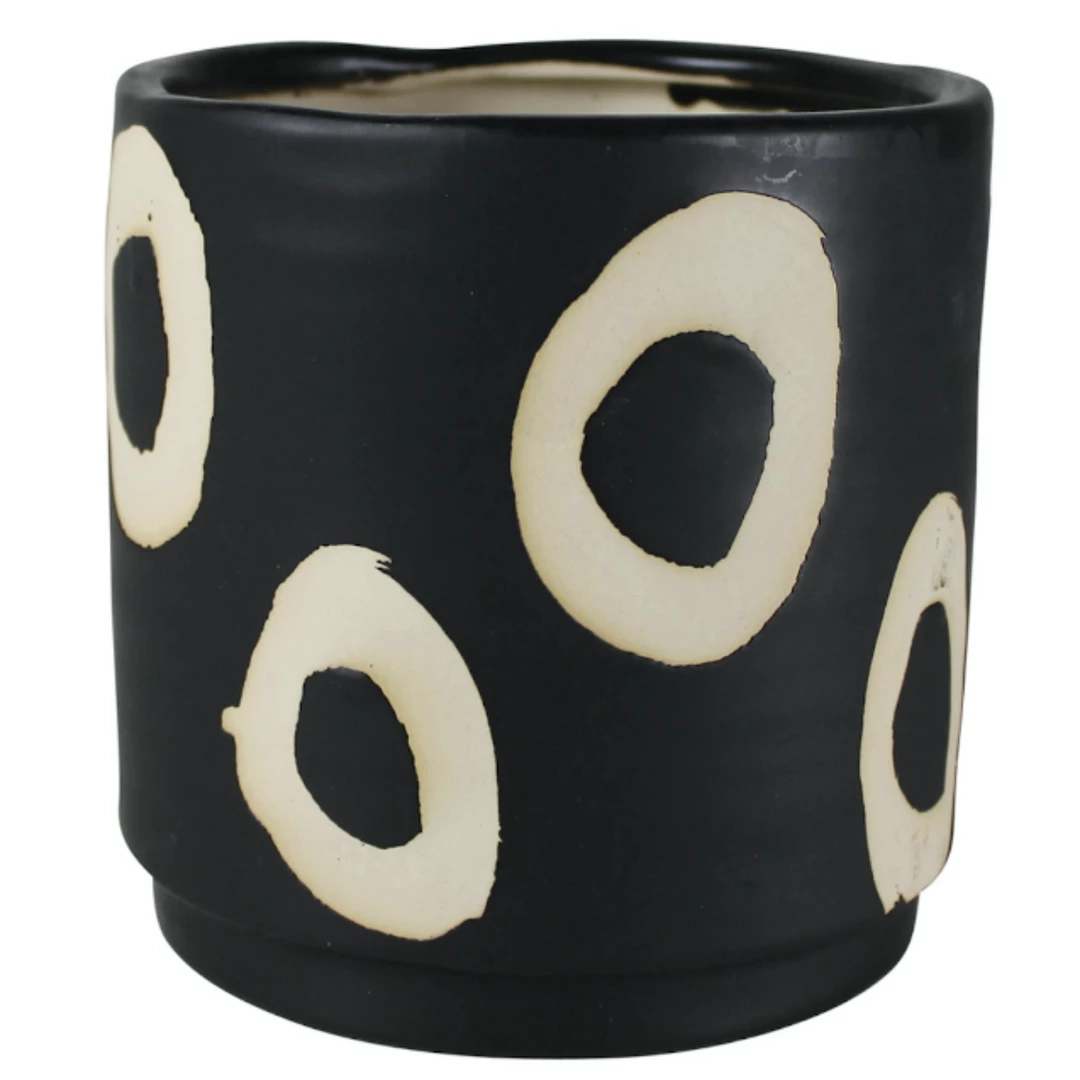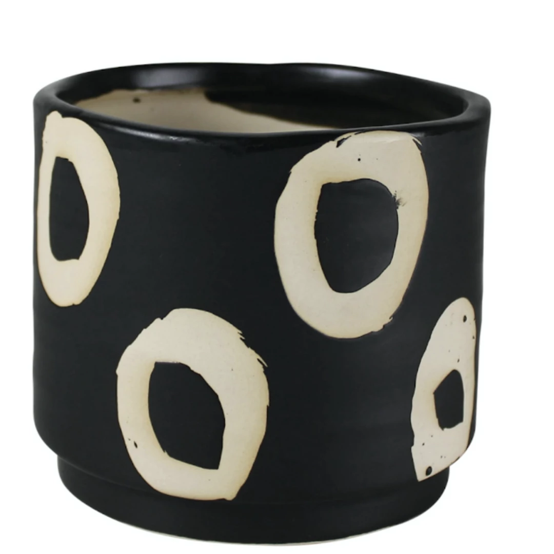 The Clarke Circle Cachepot is a cachepot with a black matte glaze. It has hand drawn circles creating simple forms with organic flare.