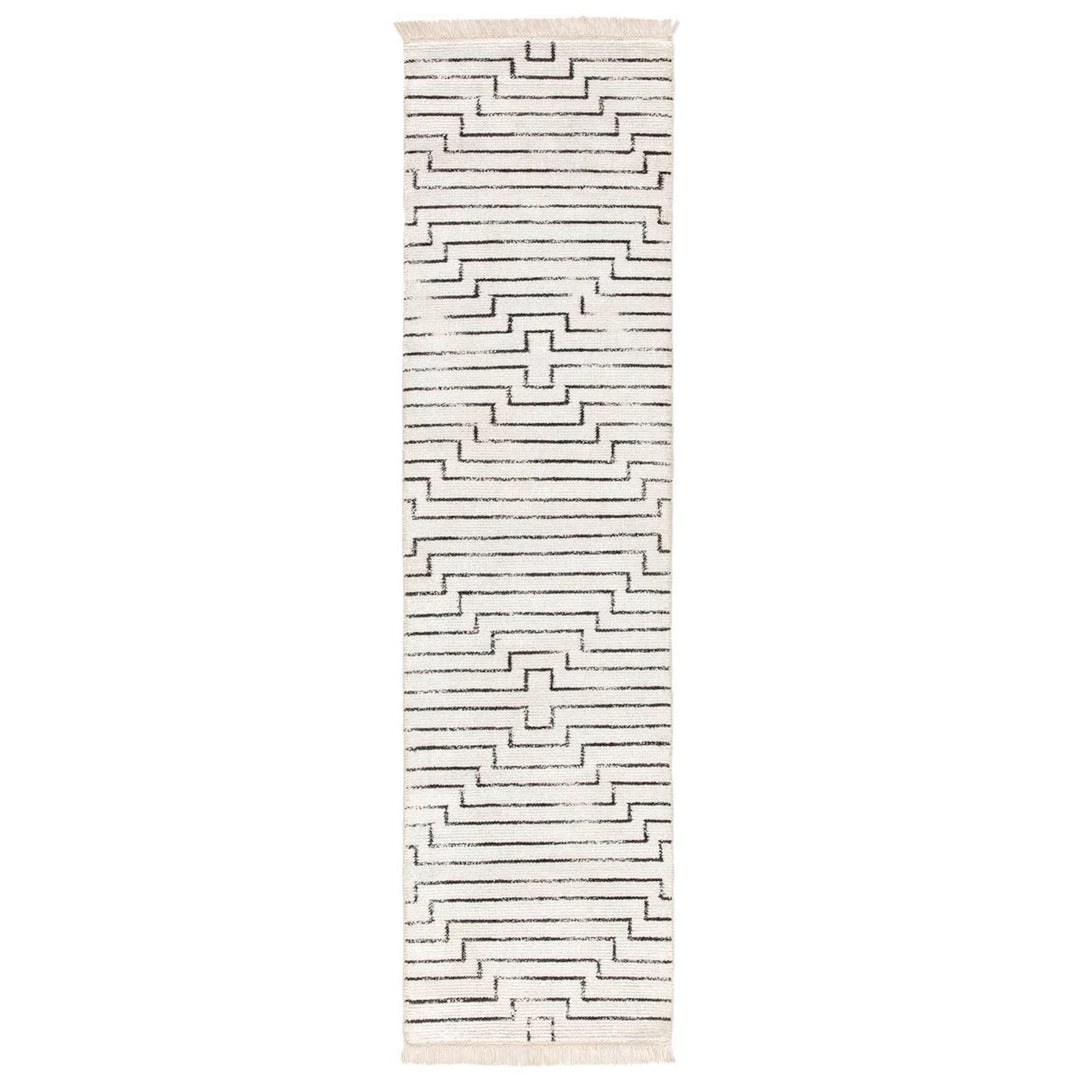 Handloomed. 100% Viscose. This modern hand-loomed rug enriches spaces with bold geometric patterning and a temptingly soft feel. Texture-rich and captivating in sleek spaces, this accent showcases a graphic linear design in a classic black and white colorway.