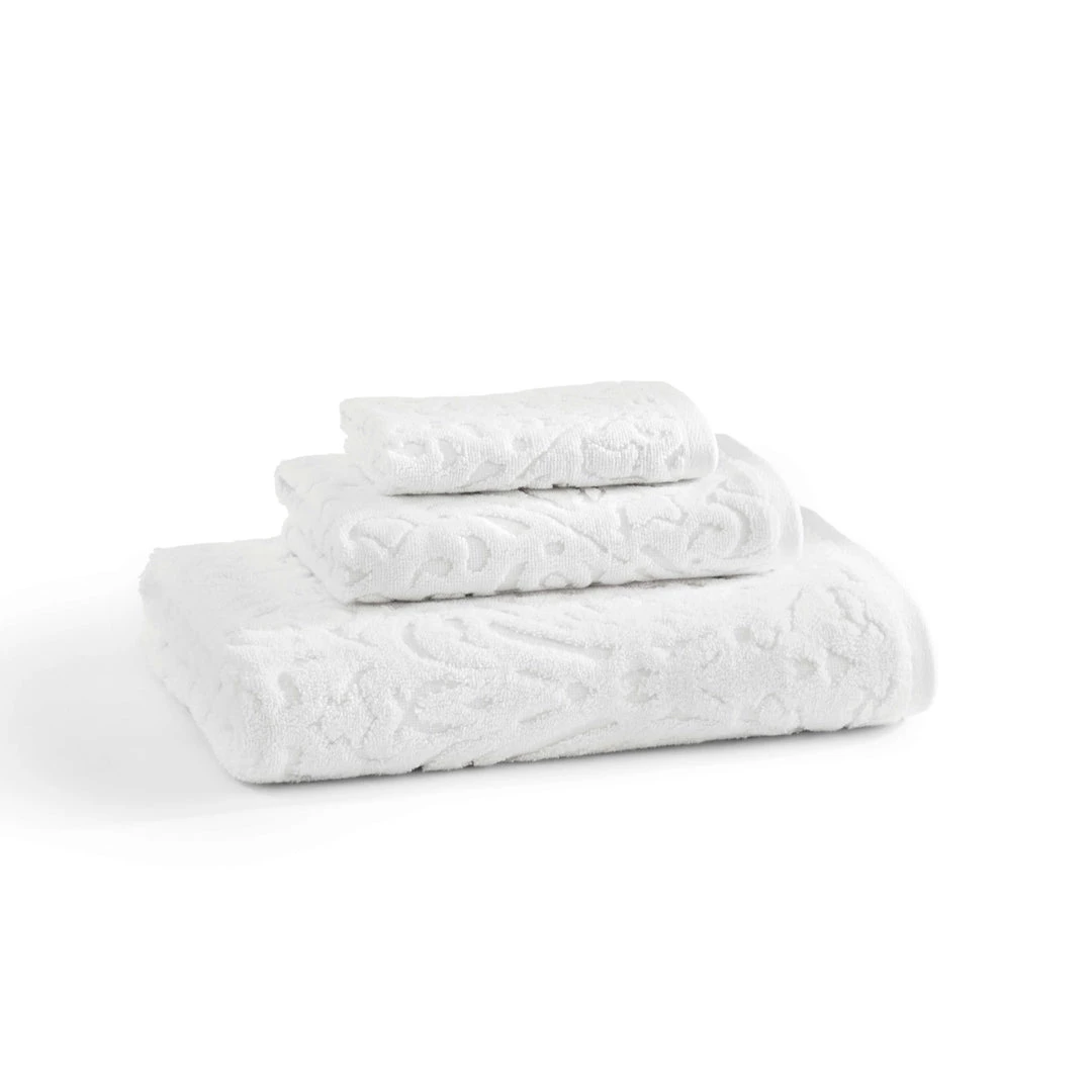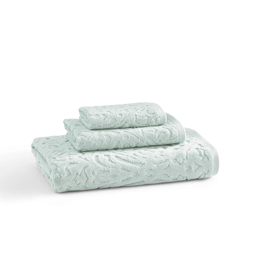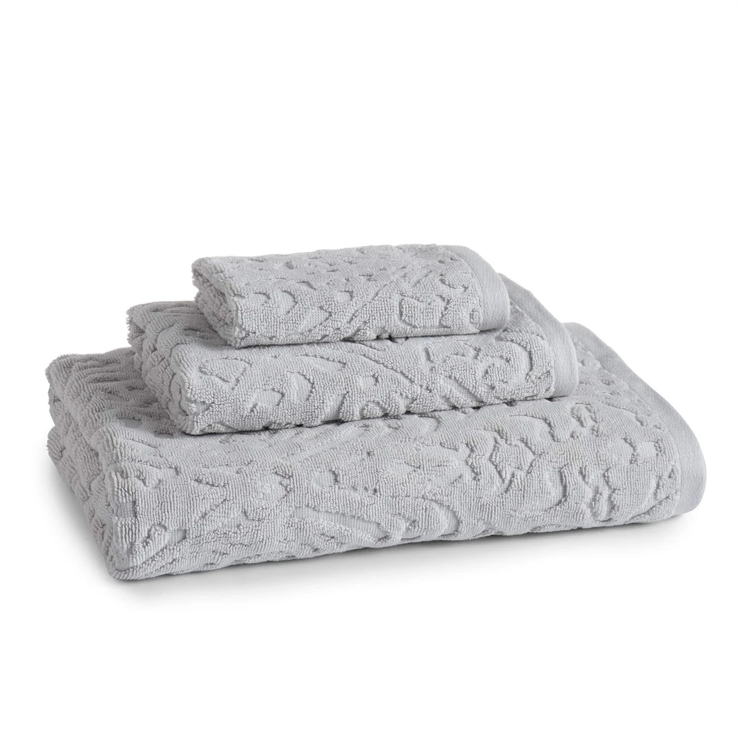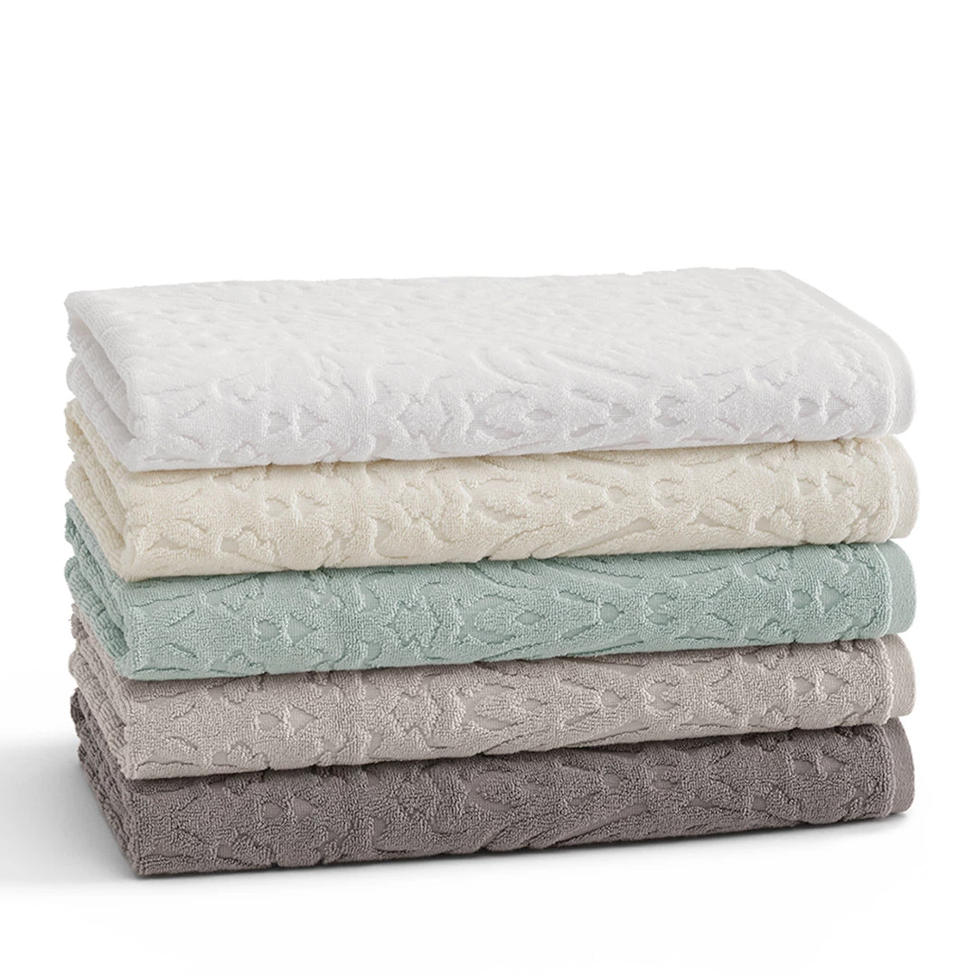 100% long-staple combed Turkish cotton piece dye jacquard, Plush 650 GSM. Bath towel and hand towel feature a sewn-in hanger loop, Made in Turkey.