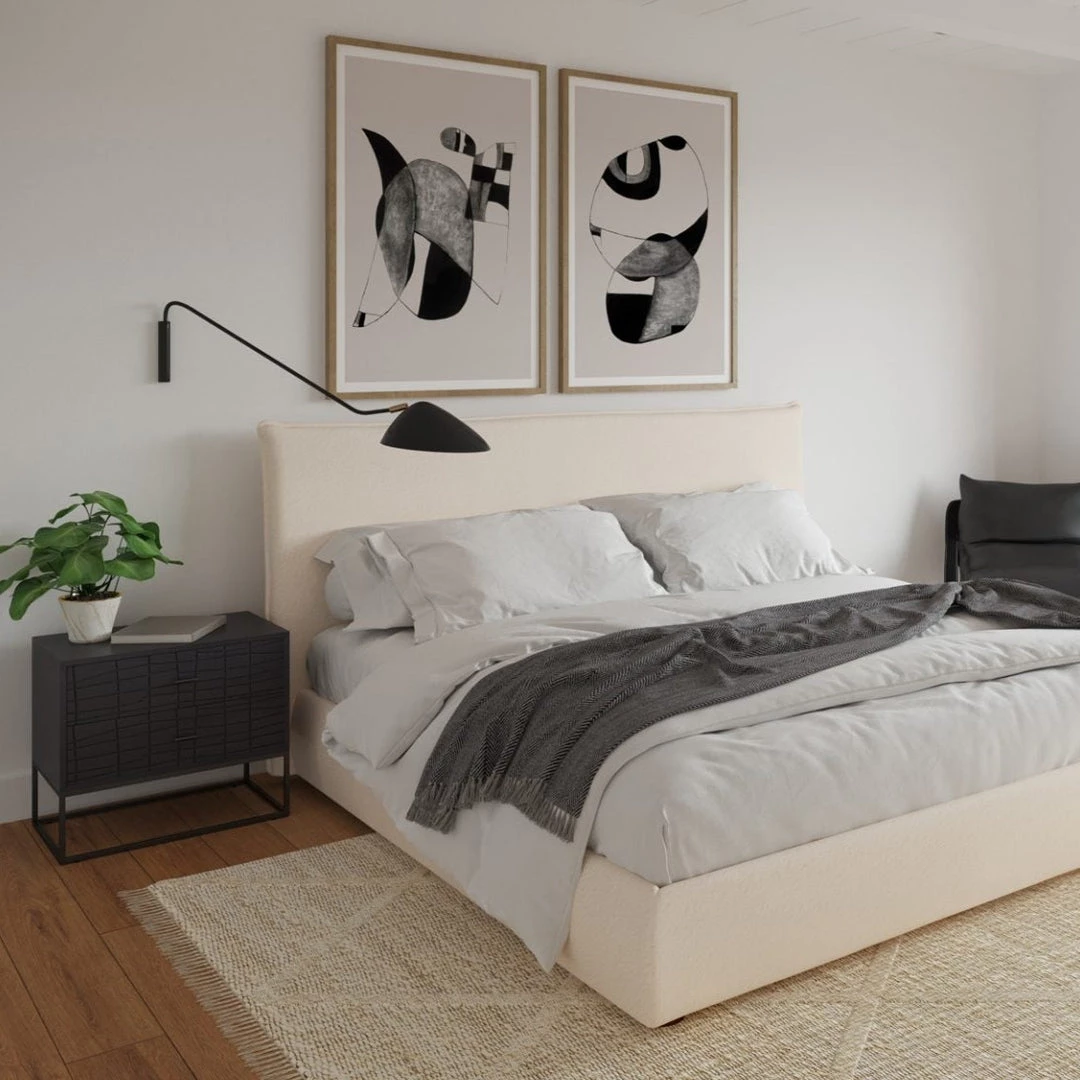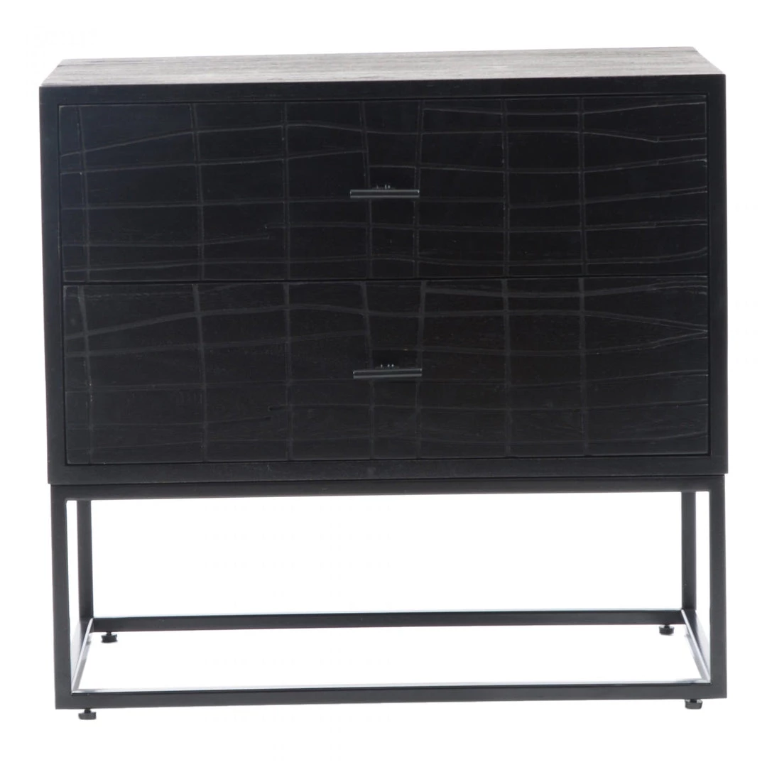 The Atelier nightstand features two sliding drawers with textured detailing. A cool iron frame supports this minimal stand. The ideal stylish spot for a complementary lamp, candle, or cup of tea.