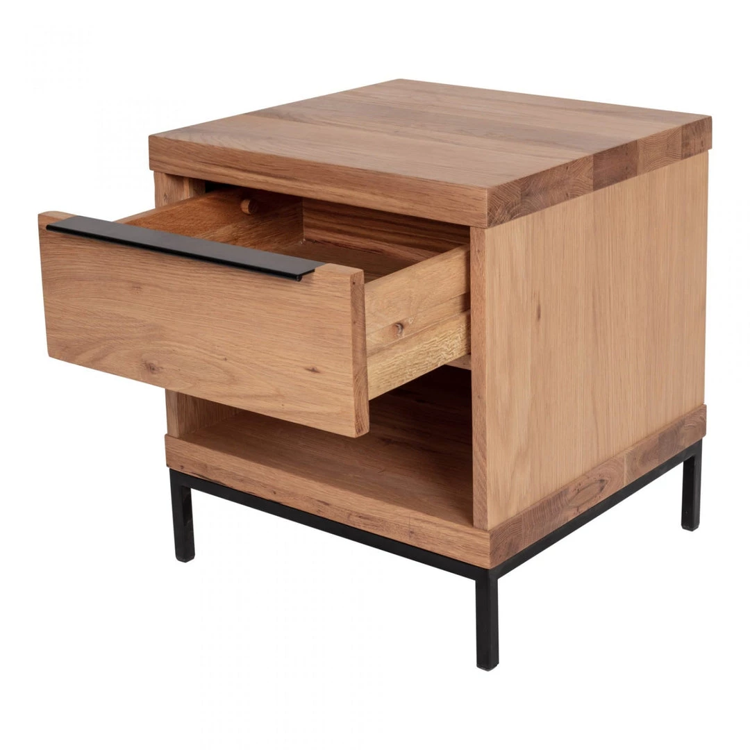 Built with solid oak wood on top of minimally designed metal legs, a nod to the Scandinavian aesthetic. Keep your bedside essentials inside the wood-glide drawer, while storing your favorite books at the bottom for easy access. Metal accents such as door handles and legs bring lightness and warmth to your bedroom space.