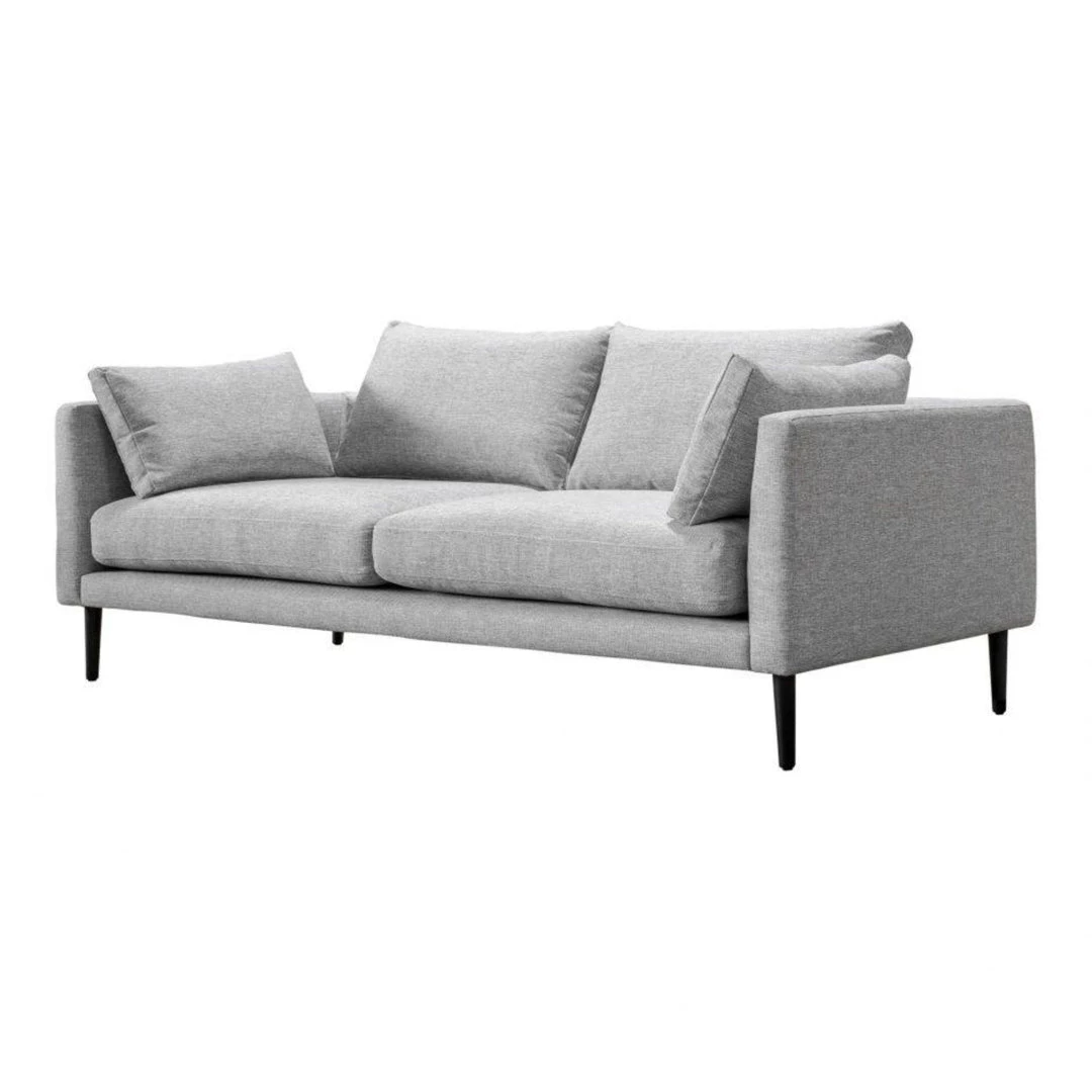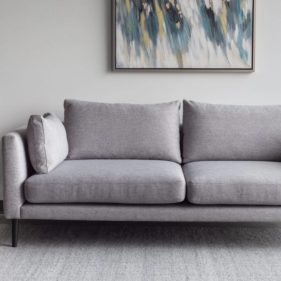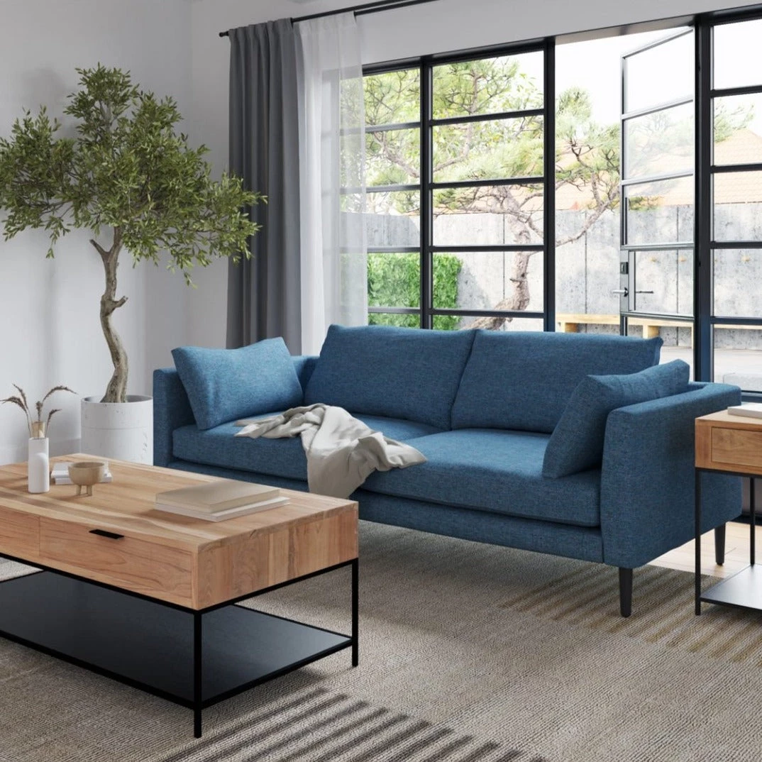 Design made simple. Clean lines, and a sturdy design give the Rafa Sofa a minimalist look. Loose cushions give this sofa an all-around cozy feel for rainy days cooped up inside. Its dark blue upholstery makes it a statement piece and adds personality to your space.