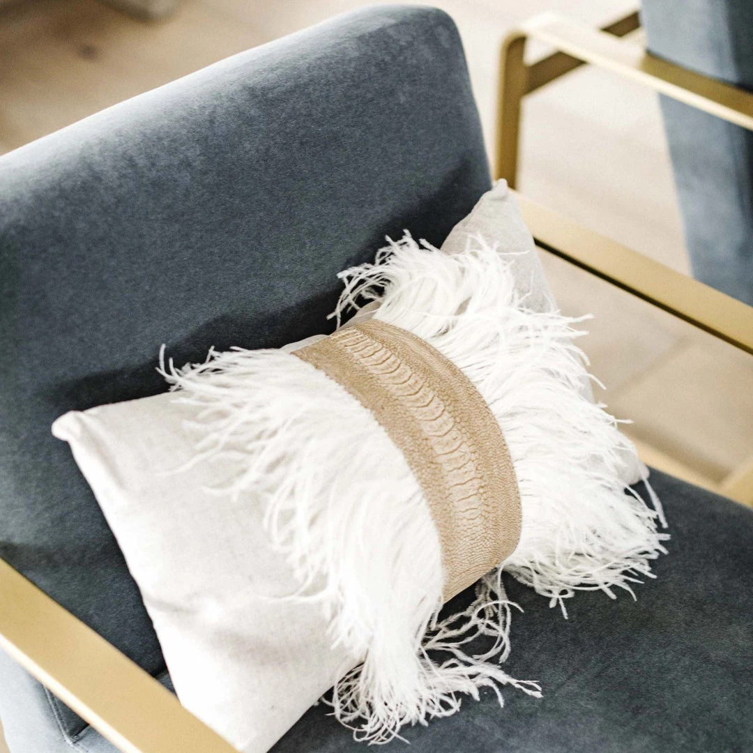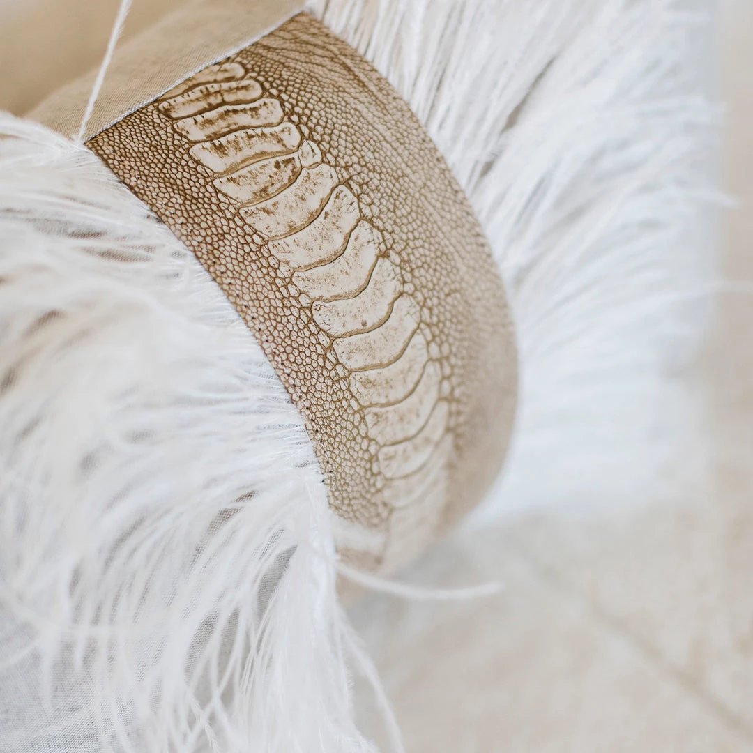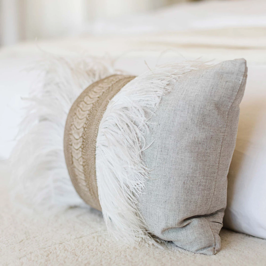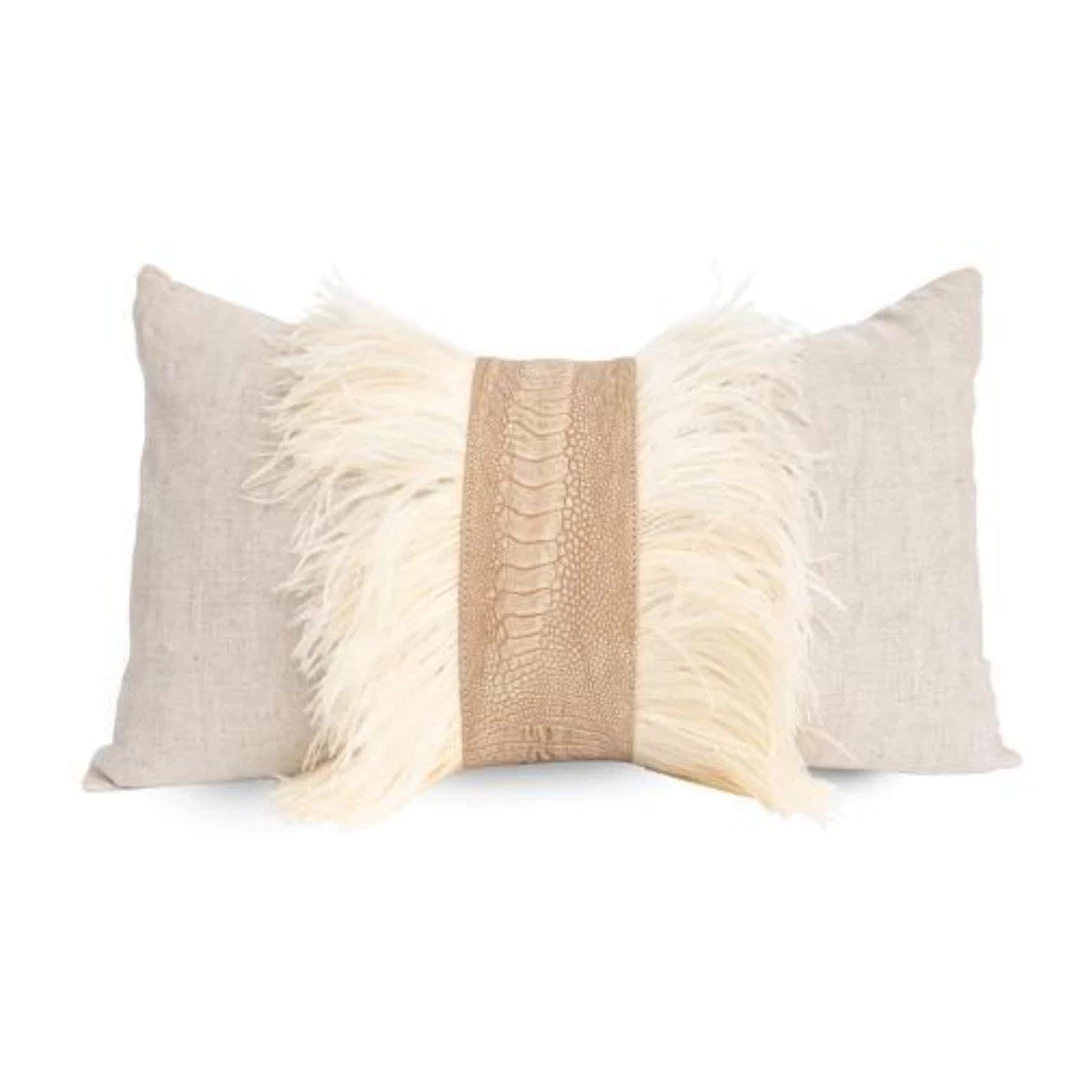 Effortlessly blending textures and natural materials, this hand-stitched natural linen lumbar pillow is embellished with a band of ostrich shin leather-trimmed with plush ostrich feathers. The ostrich leather is ethically and sustainably-sourced from regulated suppliers of the finest African ostrich leather in South Africa. A feather-and-down insert ensures long-lasting comfort. Due to the use of natural materials, each piece is unique and may vary slightly from the image shown.