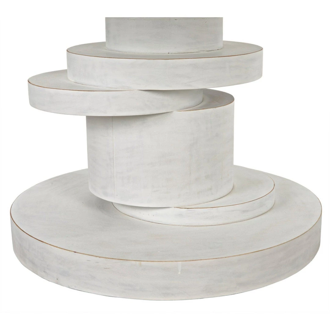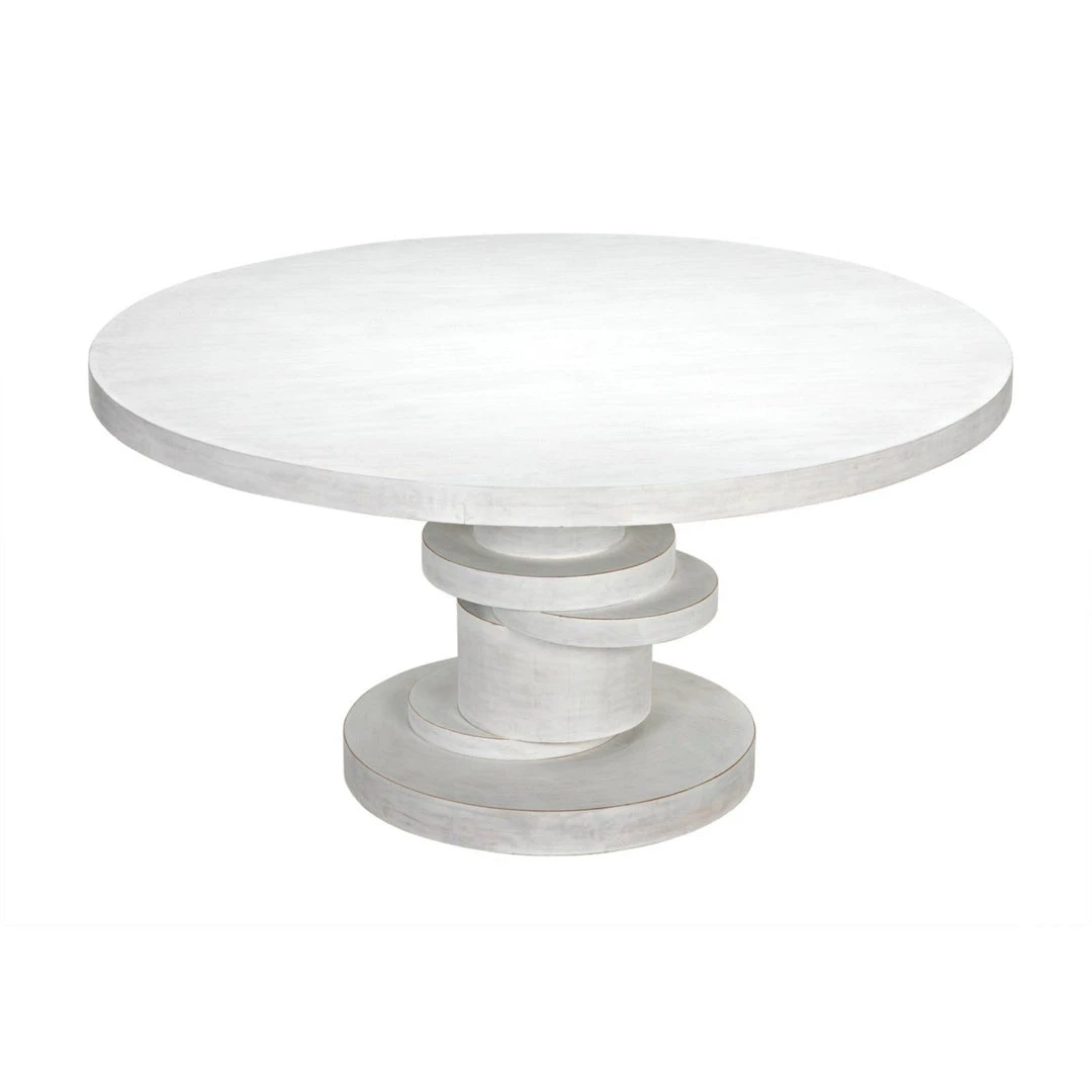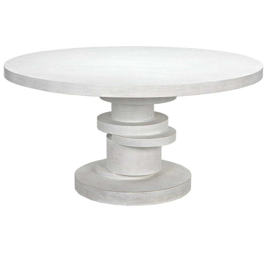The Hugo 60″ dining table features a stack of geometric, sliced discs balanced to create a uniquely detailed and distinctive base. Our whitewash and hand-rubbed black finish create texture and depth with a subtle reveal of the wood beneath.