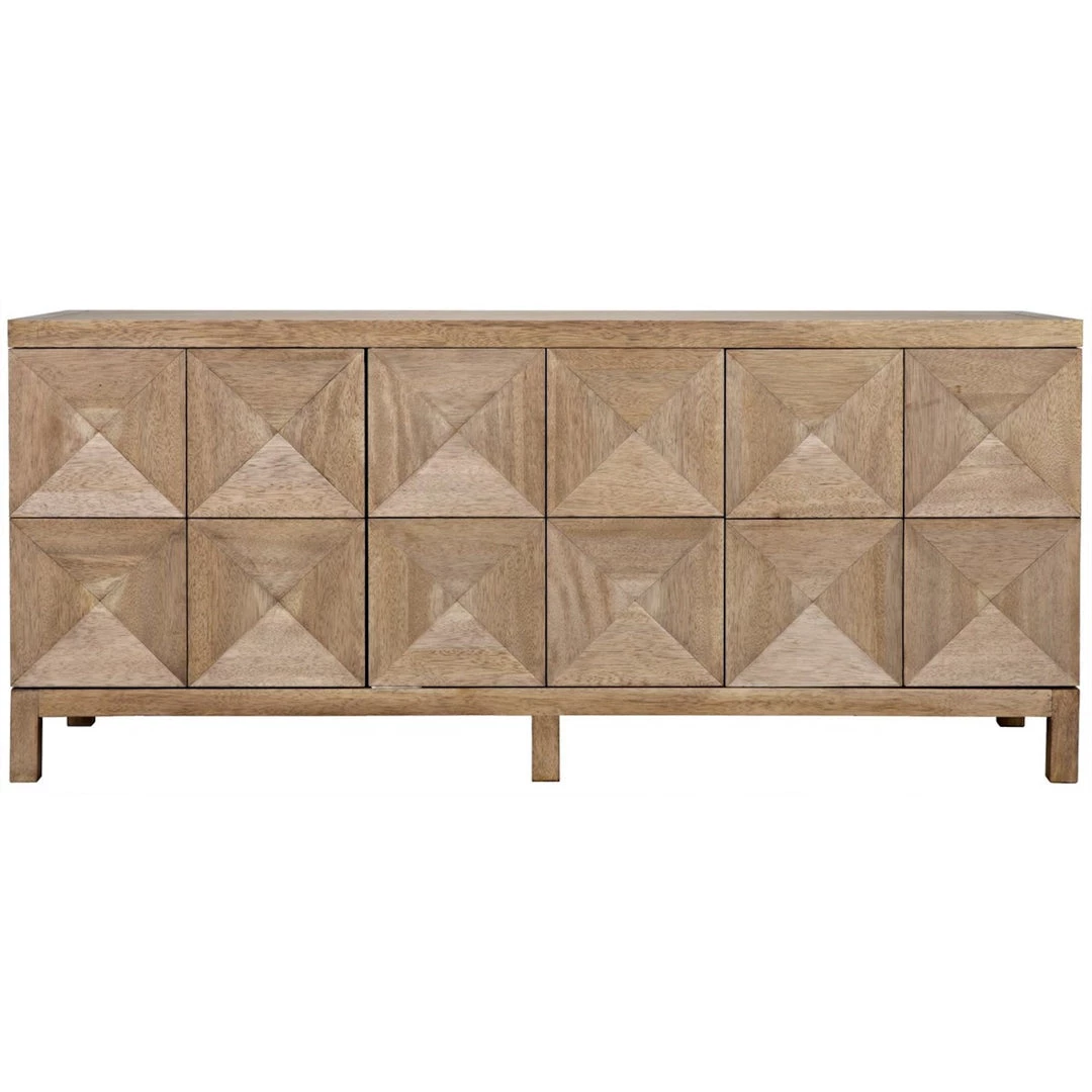 This classic yet contemporary design features three geometrically carved doors that open via a hidden push latch to reveal two large interior cupboards. Artisan crafted and finished without sealer, the walnut receives a coat of wax, allowing the table to age naturally over time.