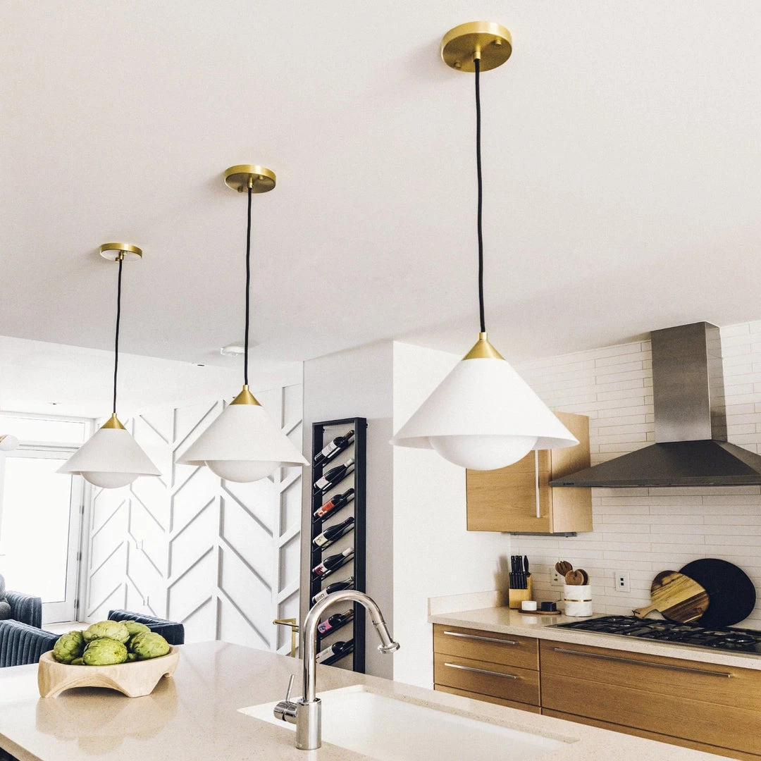 An elegantly modern pendant, the Hilton’s conical shade is topped with a natural brass pop of contrast – and finished with the same warm brass canopy. Another unique sculptural detail of this pendant is its milk glass globe that houses a bulb to create a subtle glow. Perfect for over a kitchen island or sink.