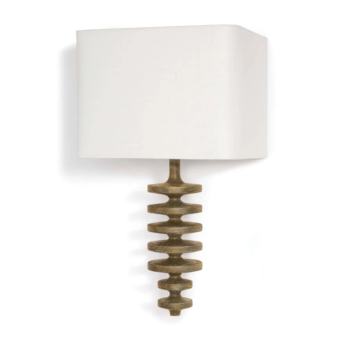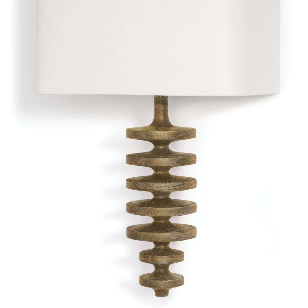 Textured bands ripple down the graduated column of our sculptural Phoenix sconce. Corrugated birch wood is handcrafted by artisans and balanced with a natural linen shade. The elegant profile makes a simple yet stunning statement to a living room, bedroom or den.