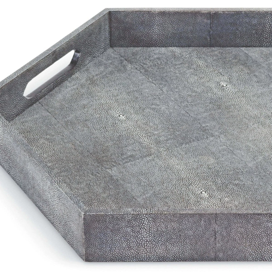 Wrapped in a colored faux shagreen, this hexagonal tray will meet your serving or display needs. Also available in two other finishes.