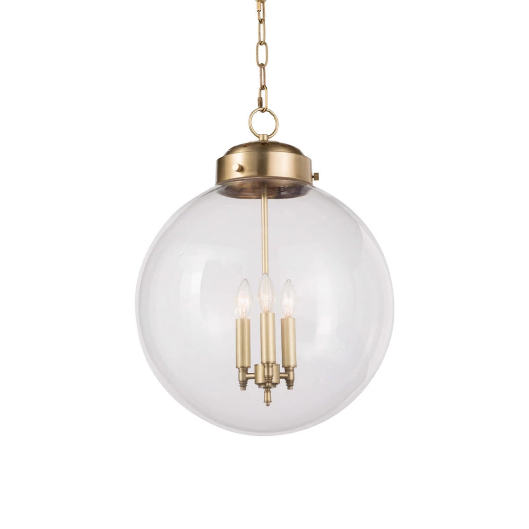 Circular glass globe pairs with three candle styled cluster to lend sculptural, contemporary style. Its clean lines and minimalist silhouette illuminate a range of spaces from entries and hallways to kitchens and dining rooms.  Available finishes in Polished Nickel, Natural Brass, and Oil Rubbed Bronze.