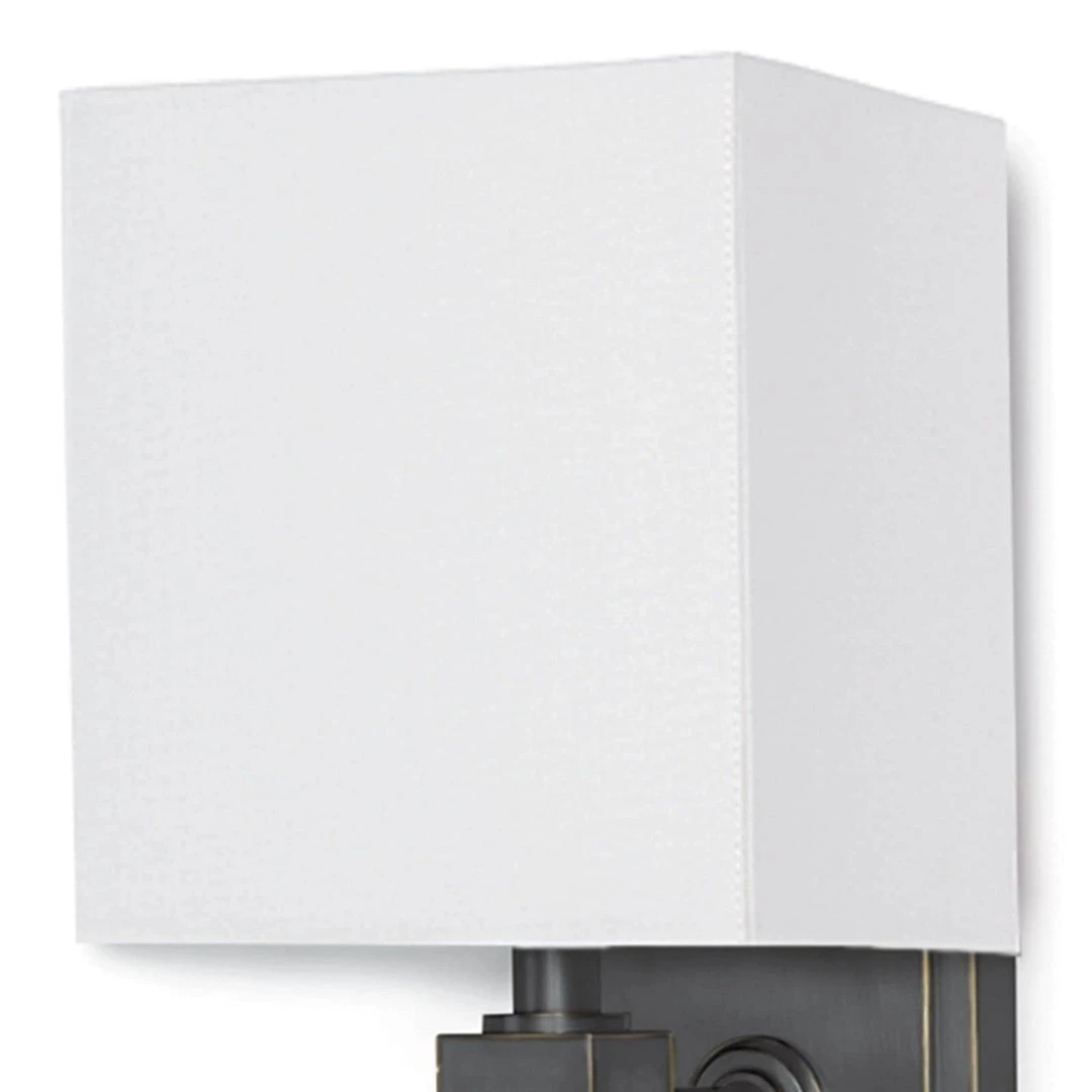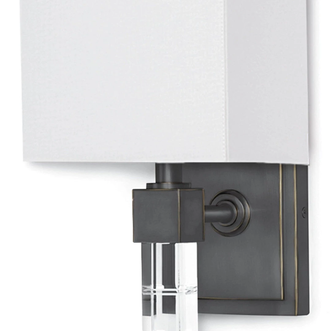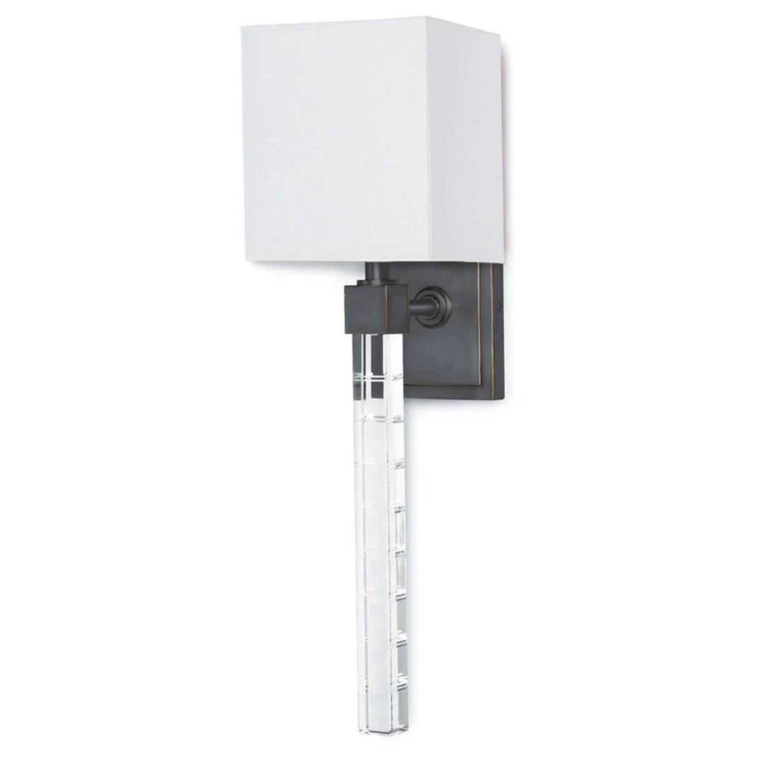 The modern silhouette and suspended cut crystal stem inspired from a high ball rocks glass this sleek sconce emotes a sophisticated style. A natural linen cube shade linen shade completes the classic look.