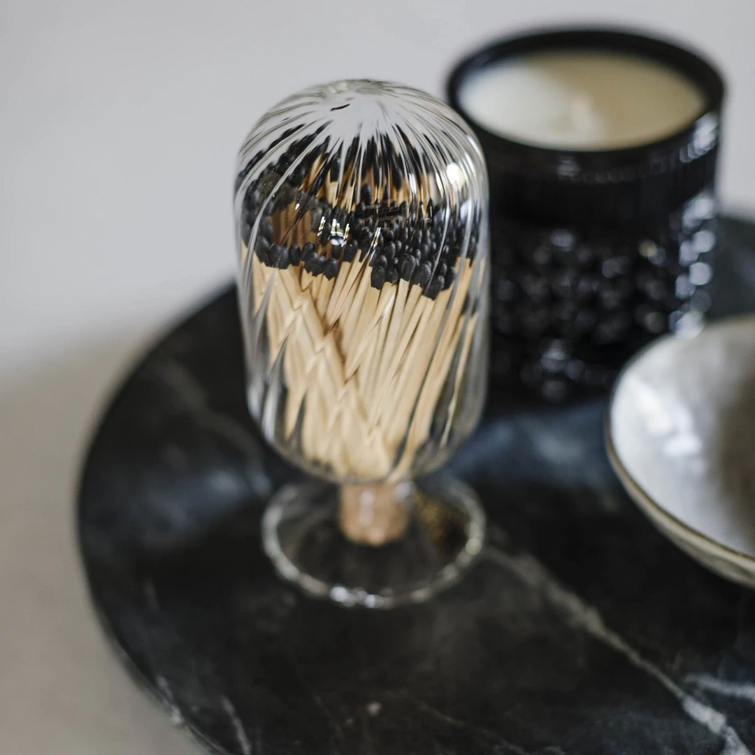 The word helix, Greek for twisted, perfectly describes the ribbed inside of our new, clear match cloche collection. The spiral texture adds interest and updates our newest style of match cloche. Crafted from hand-blown glass with 120 four-inch matches and a strike-on-bottle flint.