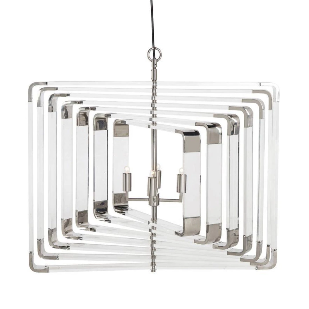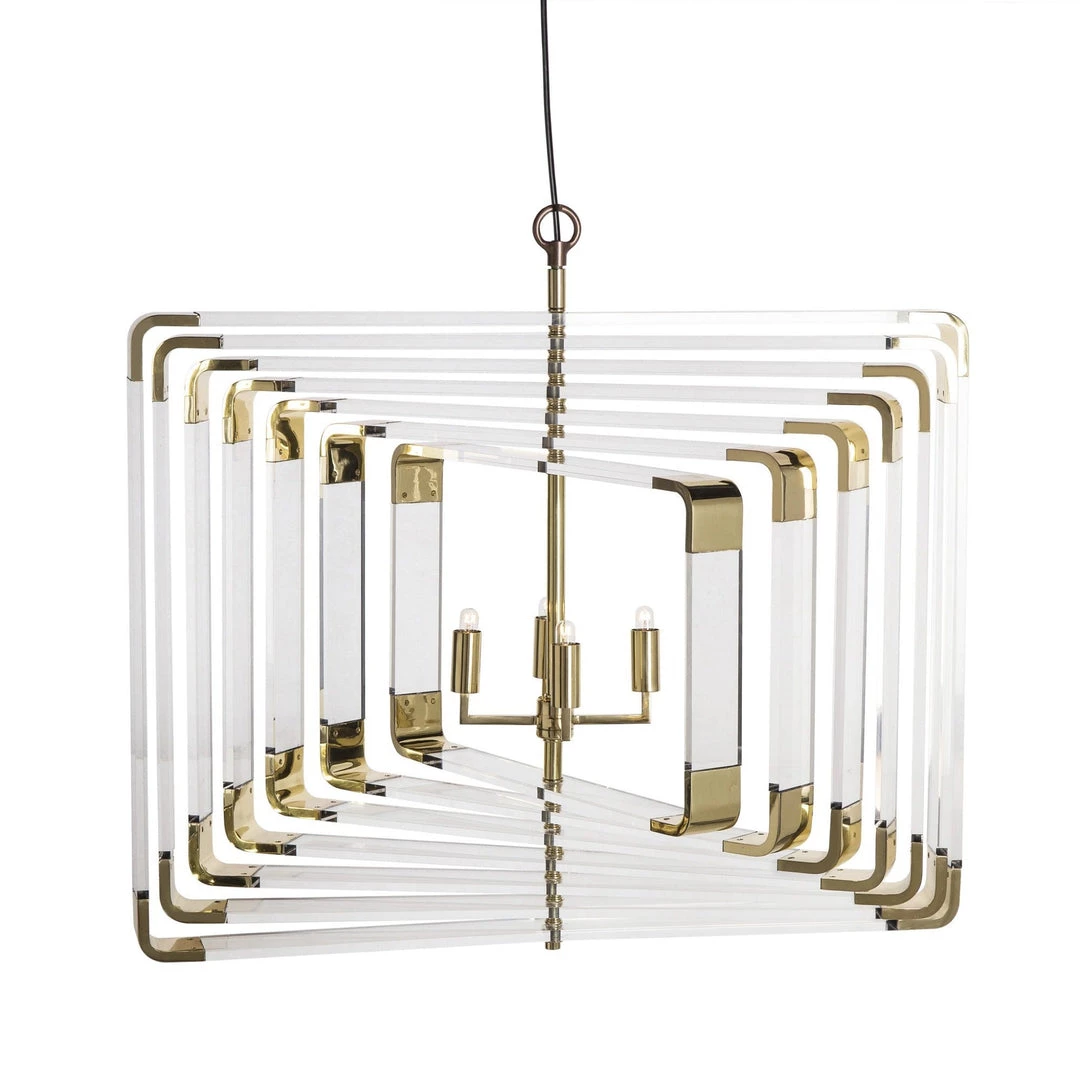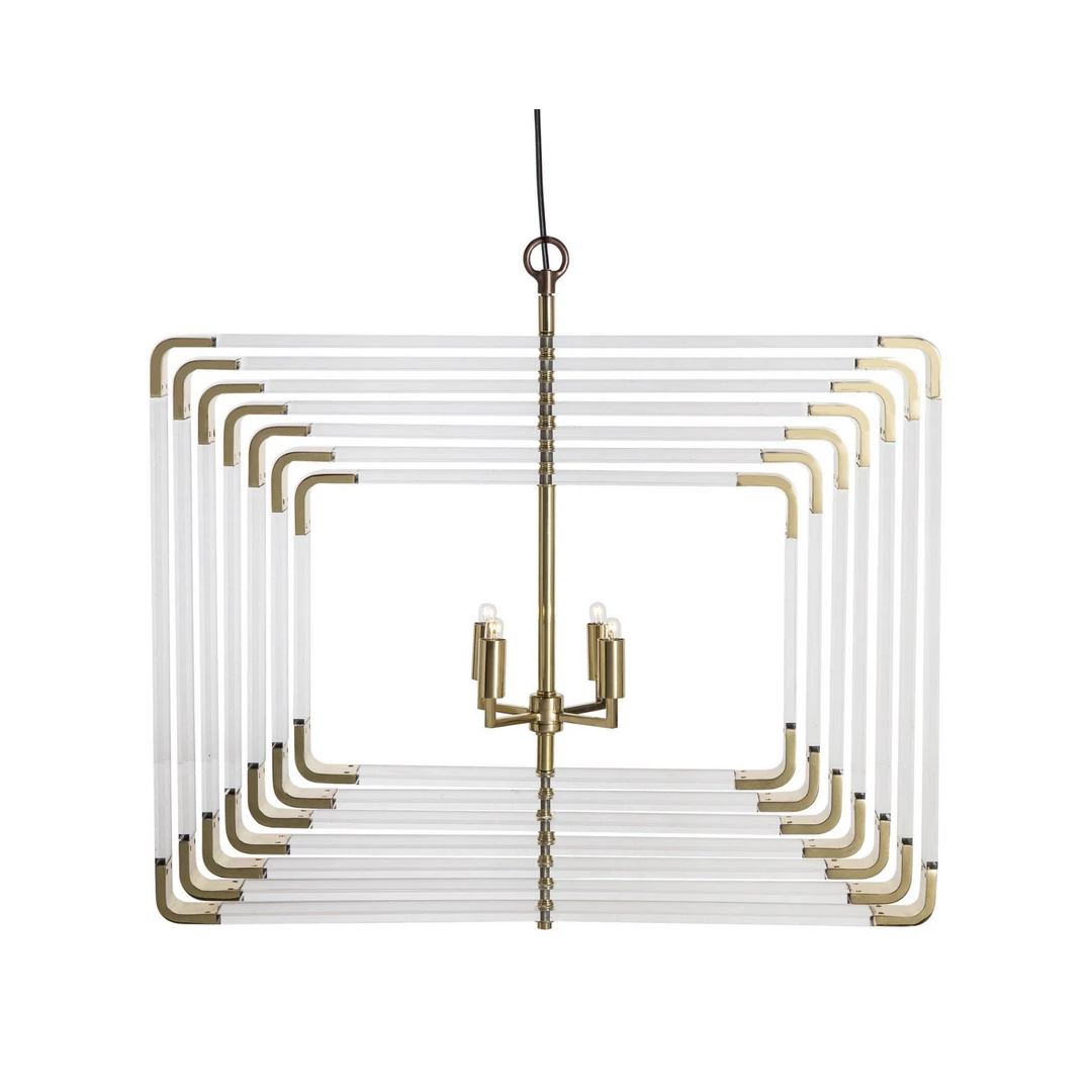A signature Nellcote Studio piece, this light was created to be a mobile luminaire sculpture for the home. Crafted from a unique combination of polished acrylic and polished brass, each of the seven layers spins independently of the other, allowing for infinite configurations and design possibilities. Four candelabra sockets provide ample light, wrapped in matching solid brass or solid nickel.
