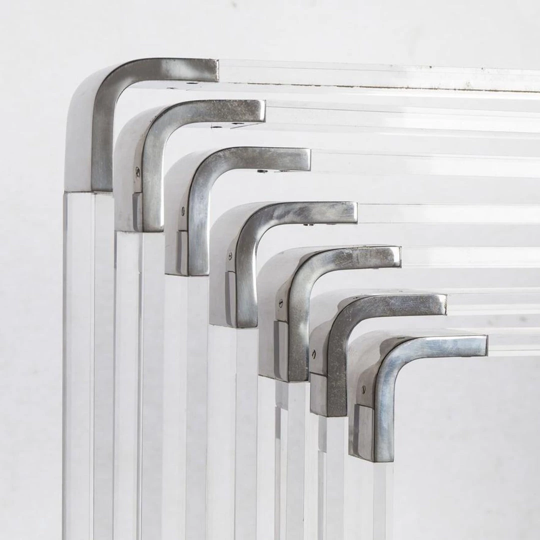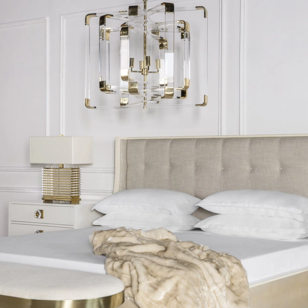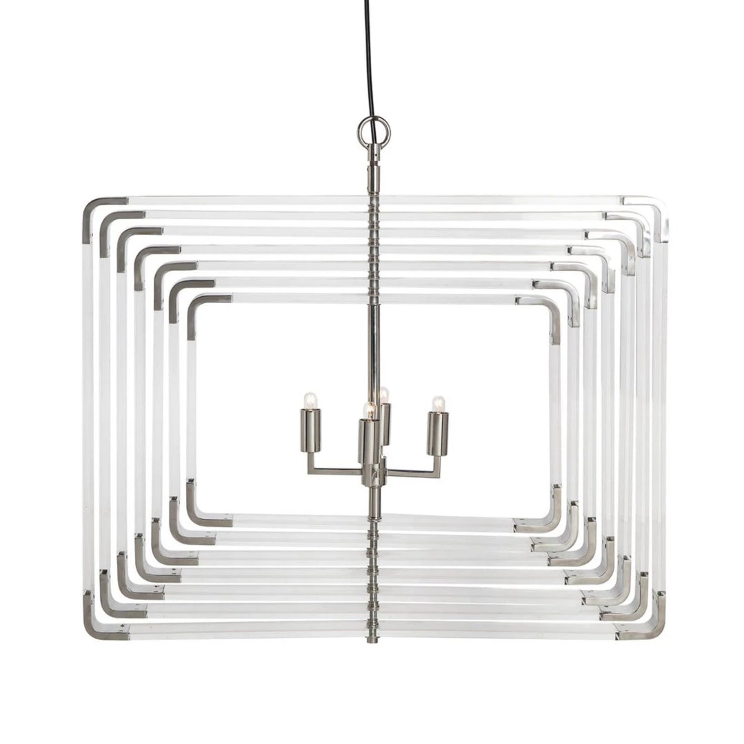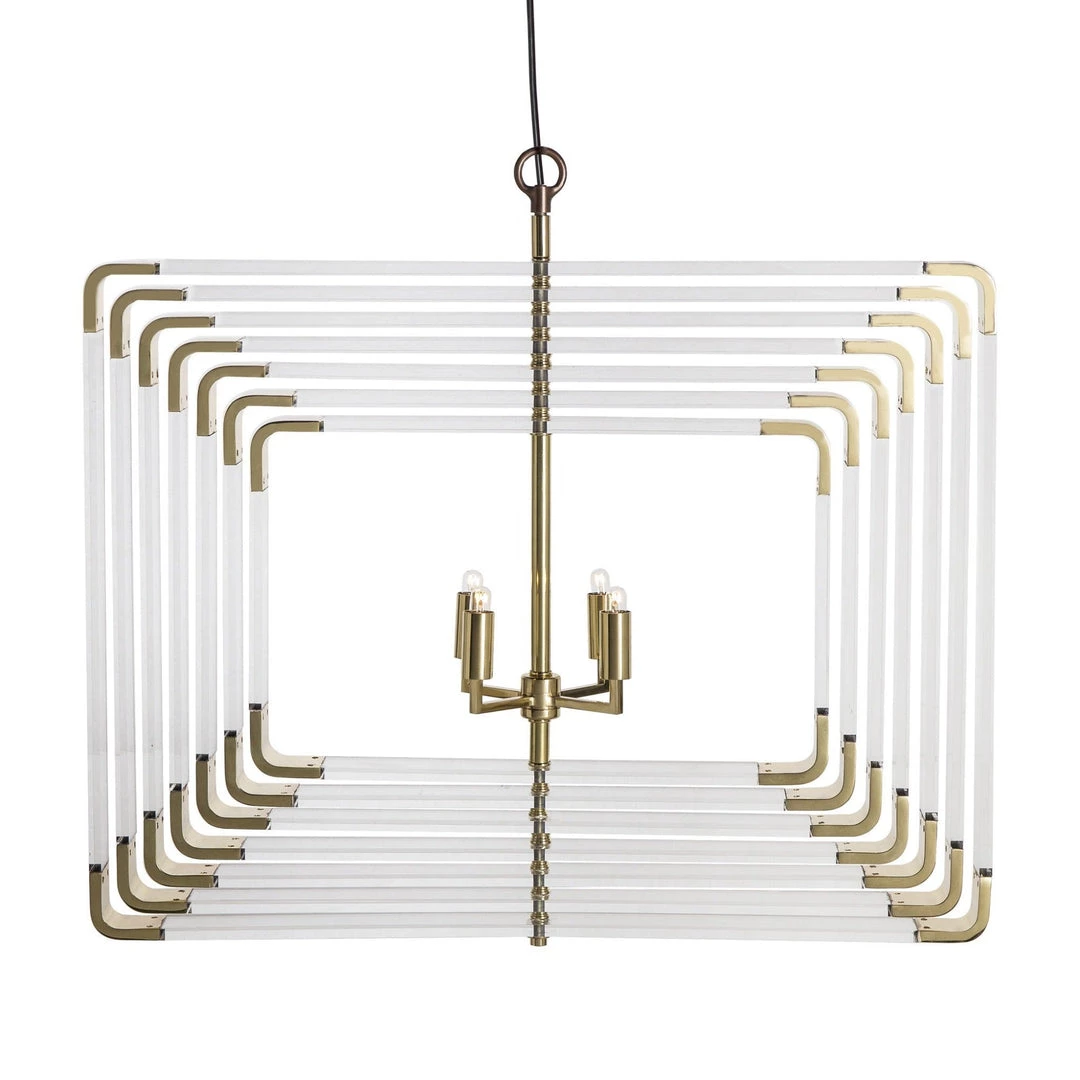 A signature Nellcote Studio piece, this light was created to be a mobile luminaire sculpture for the home. Crafted from a unique combination of polished acrylic and polished brass, each of the seven layers spins independently of the other, allowing for infinite configurations and design possibilities. Four candelabra sockets provide ample light, wrapped in matching solid brass or solid nickel.