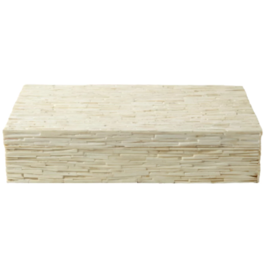 Hand-hewn chiseled bone boxes with detachable lids are intricately crafted to reflect the beauty of natural bone. Finished wooden interiors.