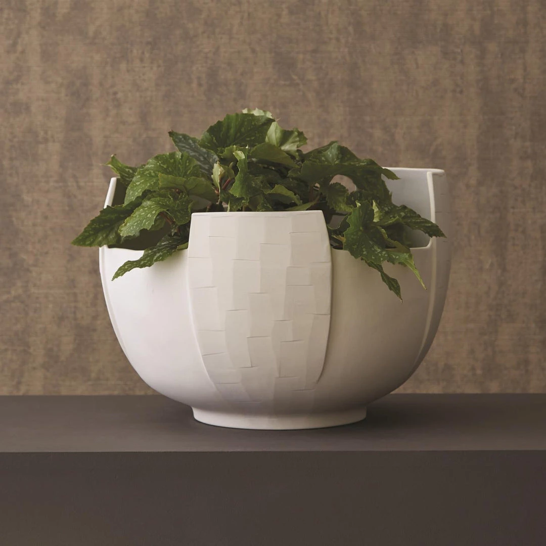 Sculptural shapes of textured, matte white porcelain resemble abstract birch forms. The interiors are finished in a glossy, reactive glaze.