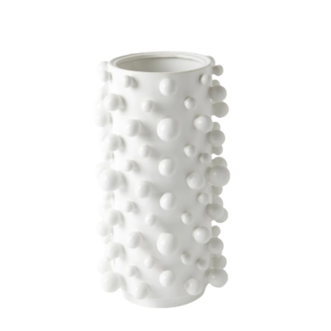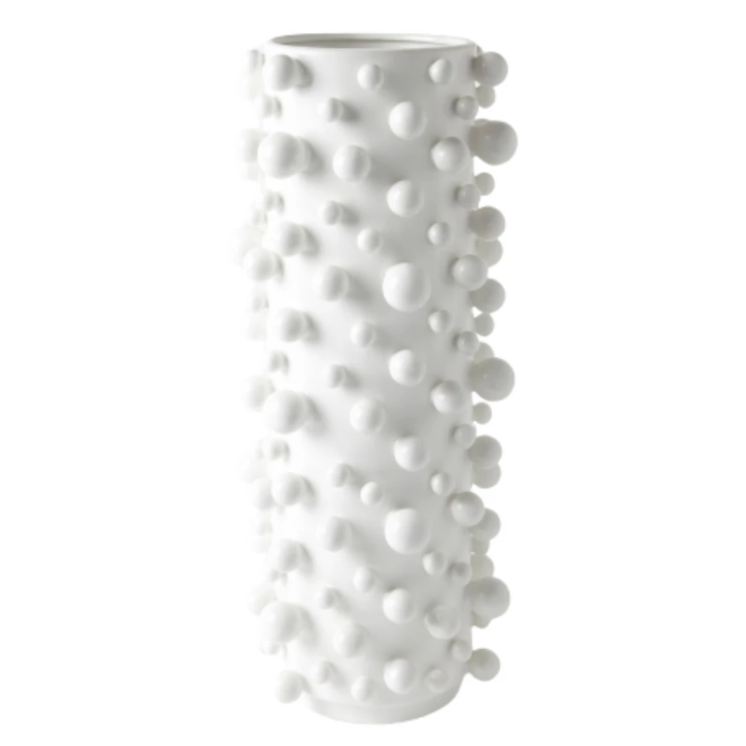 Spheres of varying sizes are playfully bound to these cylindrical ceramic vases. In fact, it’s a skillful feat to produce each vase in full molecular detail from one mold.
