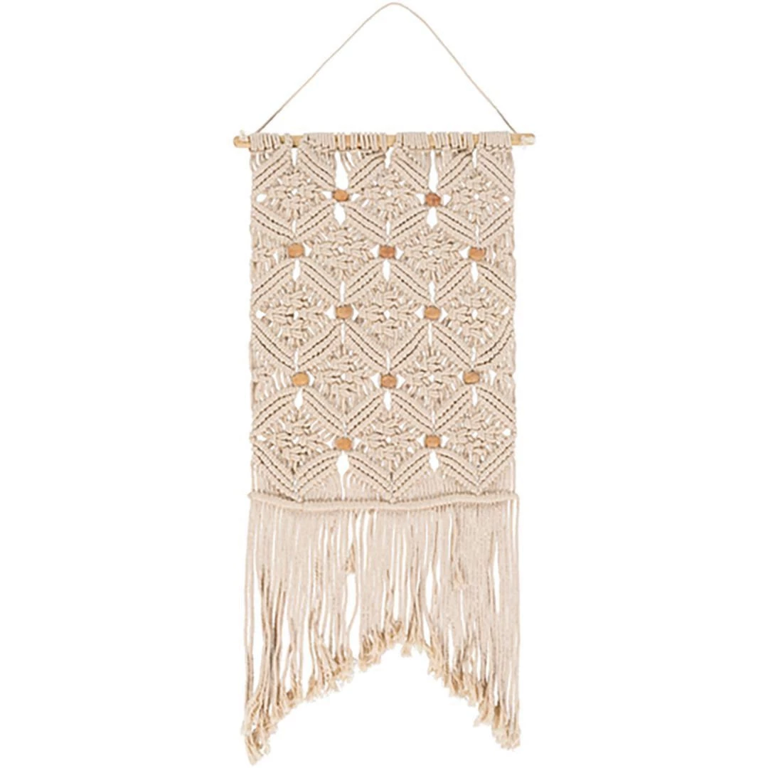 Main: 100% Cotton, Rod: 100% Wood – Pine, Macrame, Fringe, Beaded, Colors: Cream